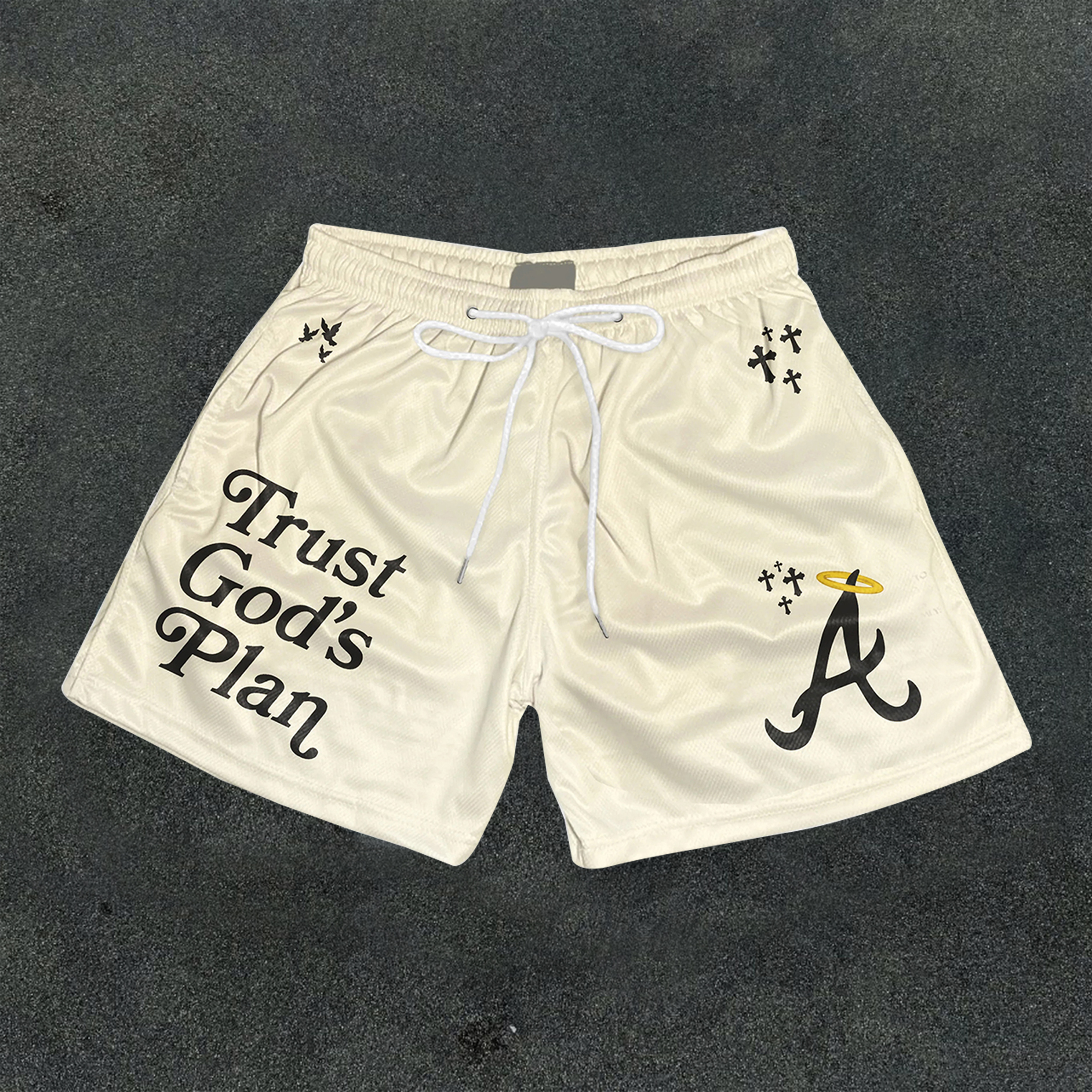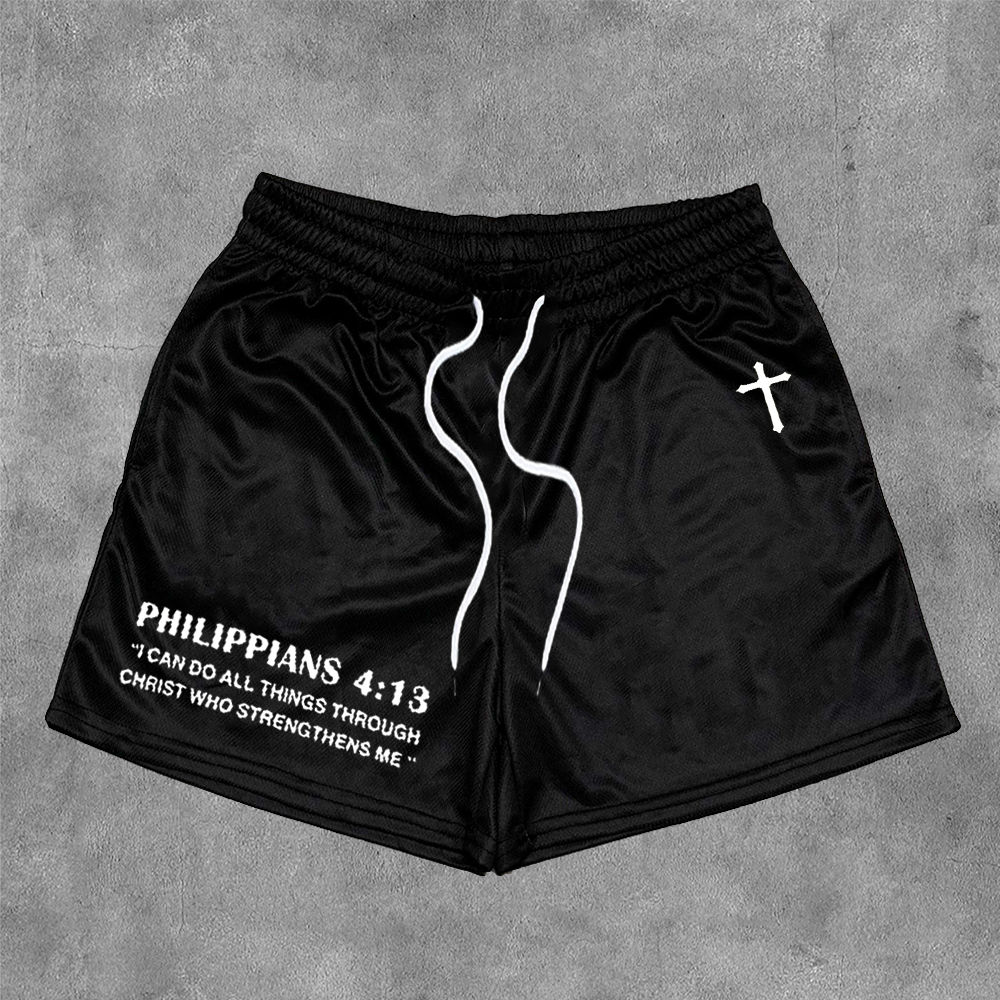 Trust God's Plan graphic-print mesh shorts