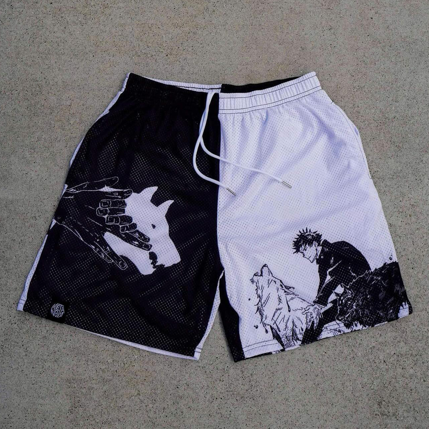 Anime print black and white patchwork mesh shorts