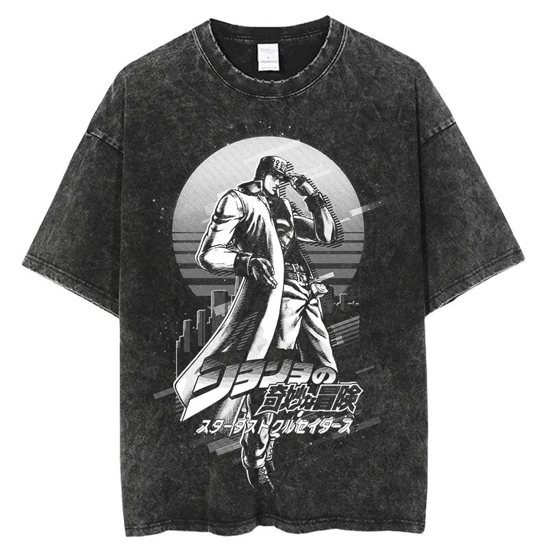 JoJo's Bizarre Adventure Epic Posing Vintage T-Shirt. Premium 100% cotton tee featuring a bold, vintage-inspired Jojo's Bizarre Adventure graphic. Oversized fit for a relaxed, streetwear look. Soft, breathable fabric. Ribbed crew neck. Double-stitched sleeves and hem. Sizes S-3XL. Machine wash cold, inside out. Perfect forJojo's Bizarre Adventure fans and casual anime style. Durable print stays vibrant. Ideal for everyday wear or cosplay events.