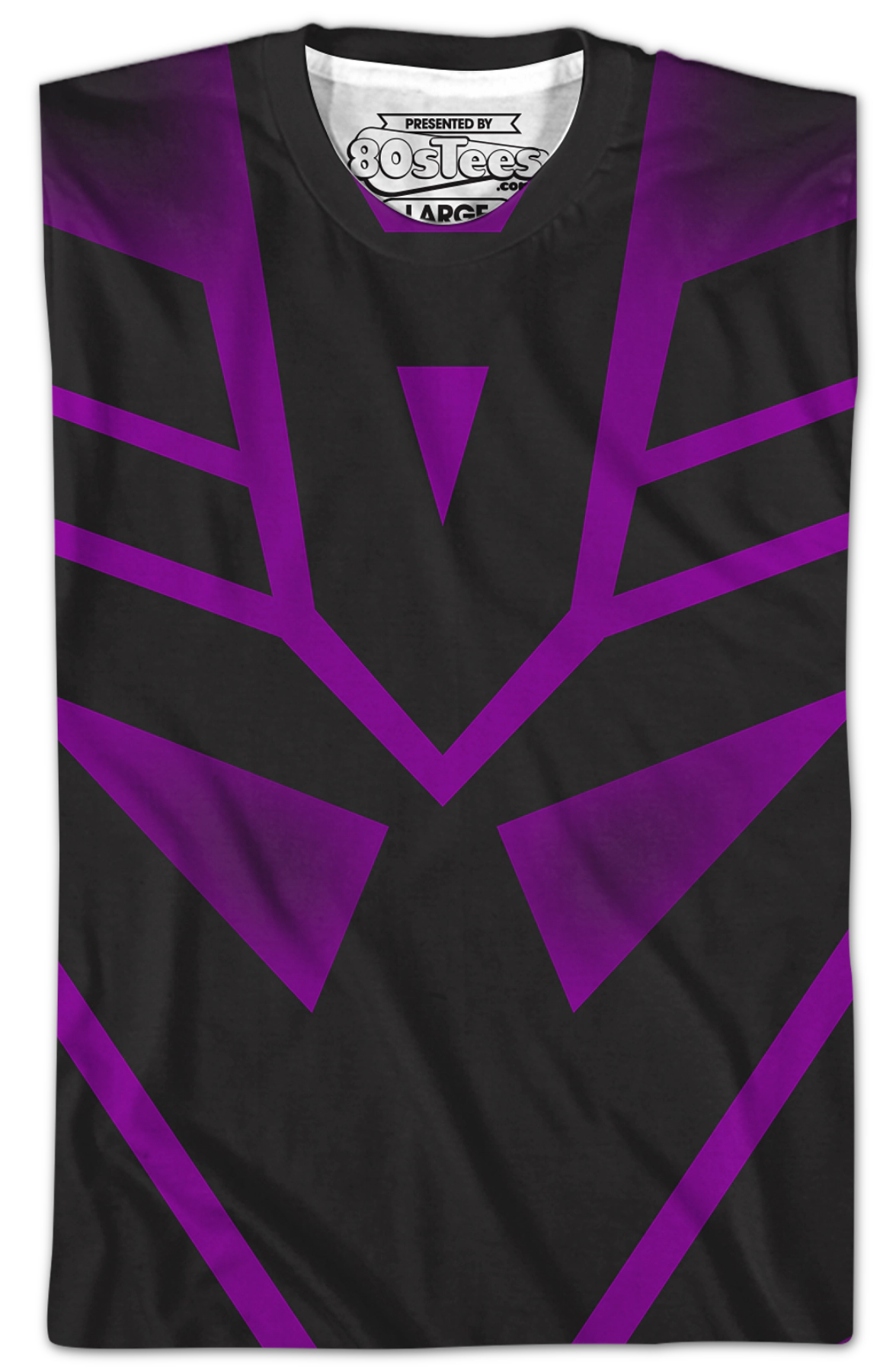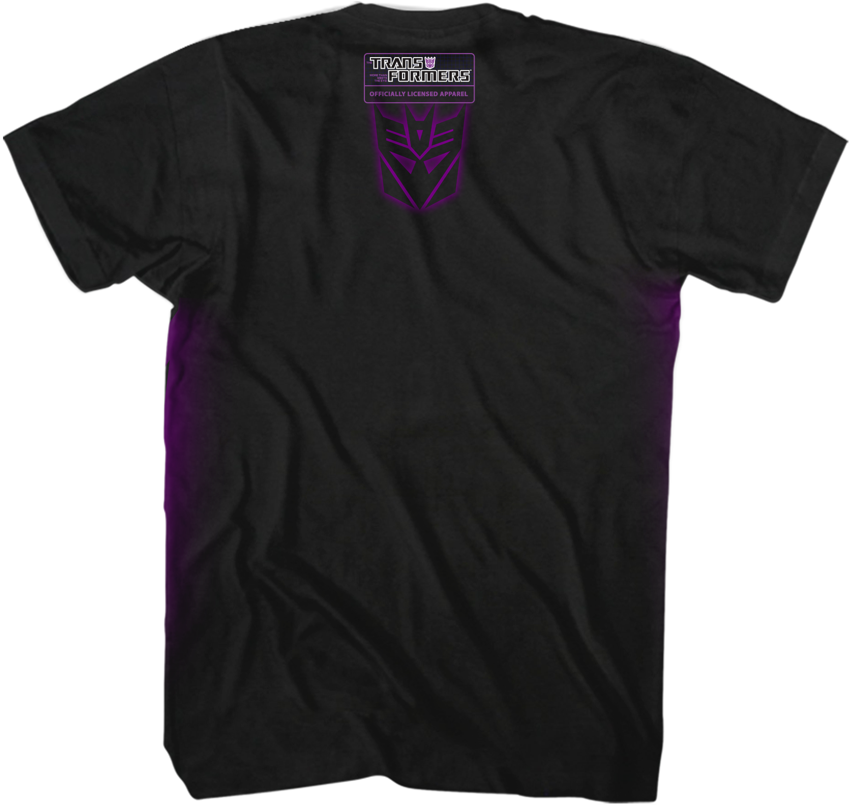 This t-shirt features a big Decepticons logo that covers the entire front of the shirt. The logo is colored in with the Decepticons' trademark purple. This logo is large enough to frighten even the most loyal Autobots fan! The back of the shirt shows a smaller Decepticons logo and the unmistakable Transformers logo.