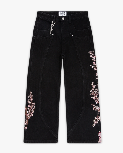A fan favourite, brought back in black. Crafted with custom panelling on the front and back. Back embroidery depicting a knight beneath a blooming cherry blossom tree, with branches extending to the front panels. Finished with a custom leather tab, metal sword carabiner & 1,000,000+ stitches.
