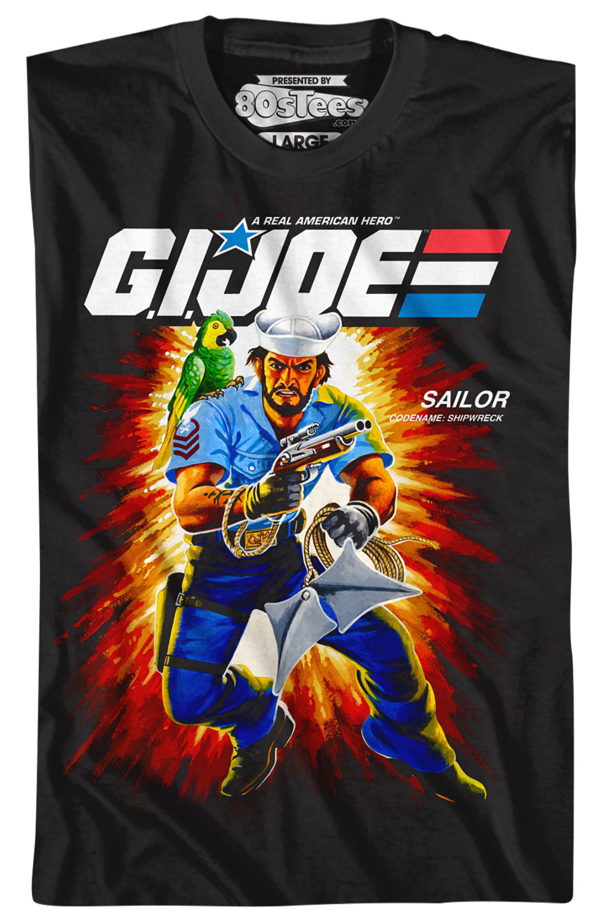 This 80sTees.com exclusive GI Joe t-shirt features the box art for the 25th anniversary Shipwreck action figure.