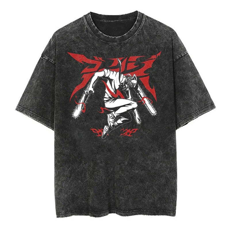 Chainsaw Man Bloody Battle Vintage T-Shirt. Premium 100% cotton tee featuring a bold, vintage-inspired Chainsaw Man graphic. Oversized fit for a relaxed, streetwear look. Soft, breathable fabric. Ribbed crew neck. Double-stitched sleeves and hem. Sizes S-3XL. Machine wash cold, inside out. Perfect forChainsaw Man fans and casual anime style. Durable print stays vibrant. Ideal for everyday wear or cosplay events.
