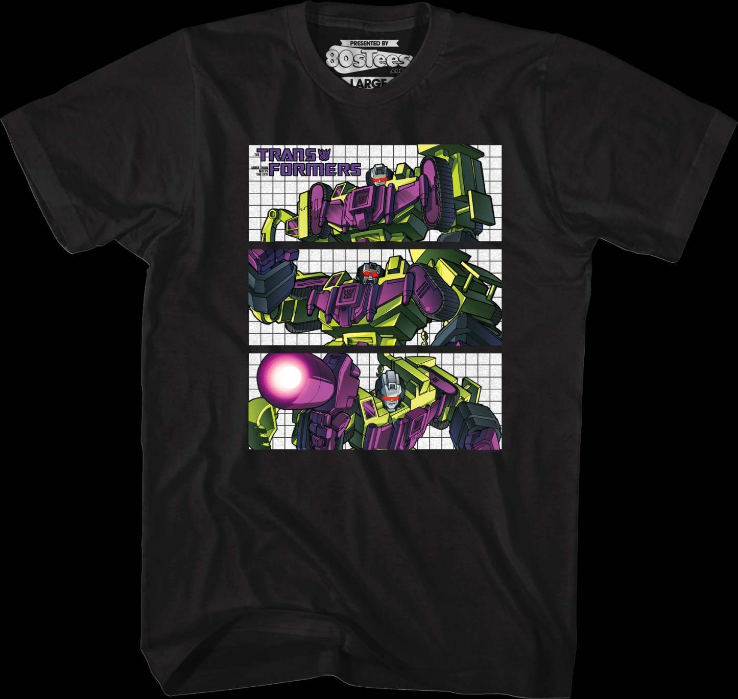 Everyone will immediately know you are a fan of the powerful warrior when you wear this 80sTees.com exclusive Devastator Frames Transformers T-Shirt!