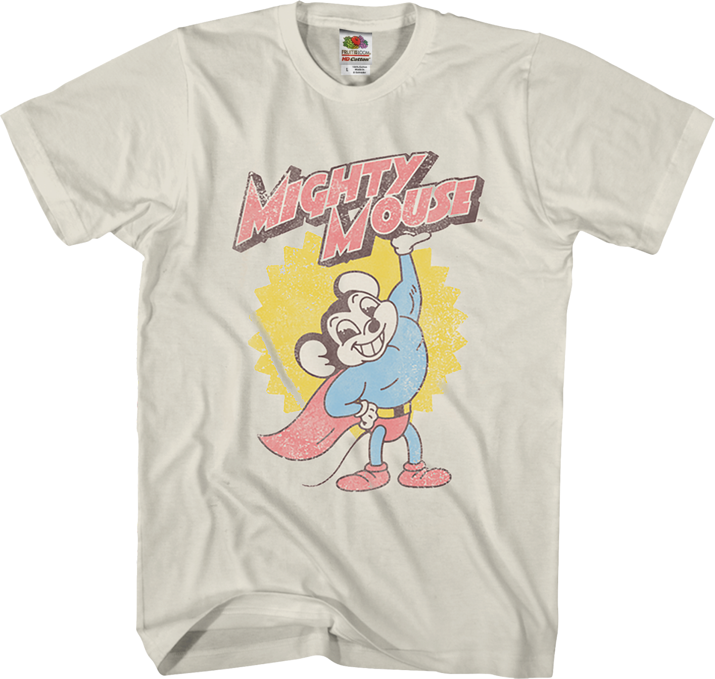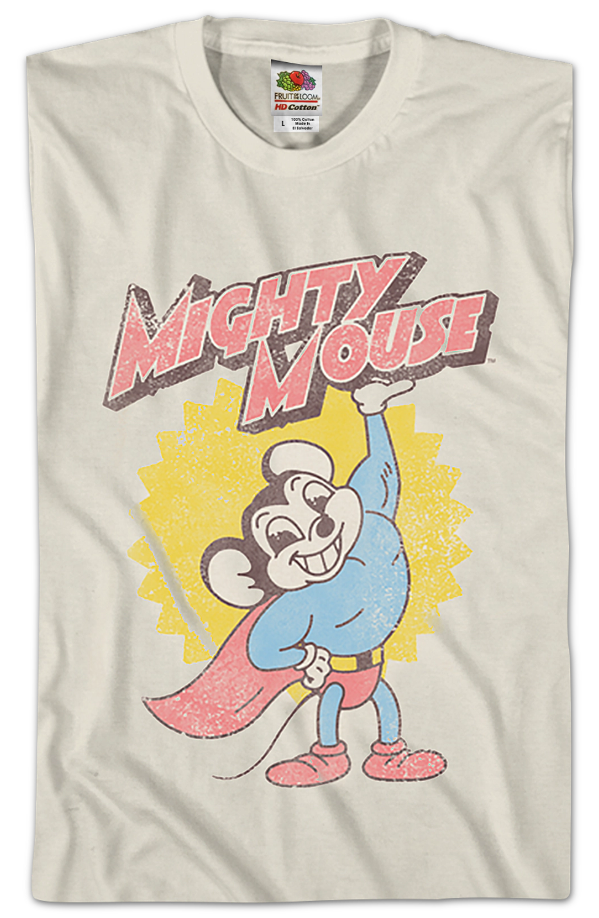 This Distressed Mighty Mouse T-Shirt features everyone's favorite superhero mouse holding up his name in block letters. The mouse who always saves the day is shown in his red and blue, caped costume. Mighty Mouse first appeared as a parody of Superman in 1942 in an animated short and went by the name Super Mouse. He continued to battle cats and other villains until 1961.