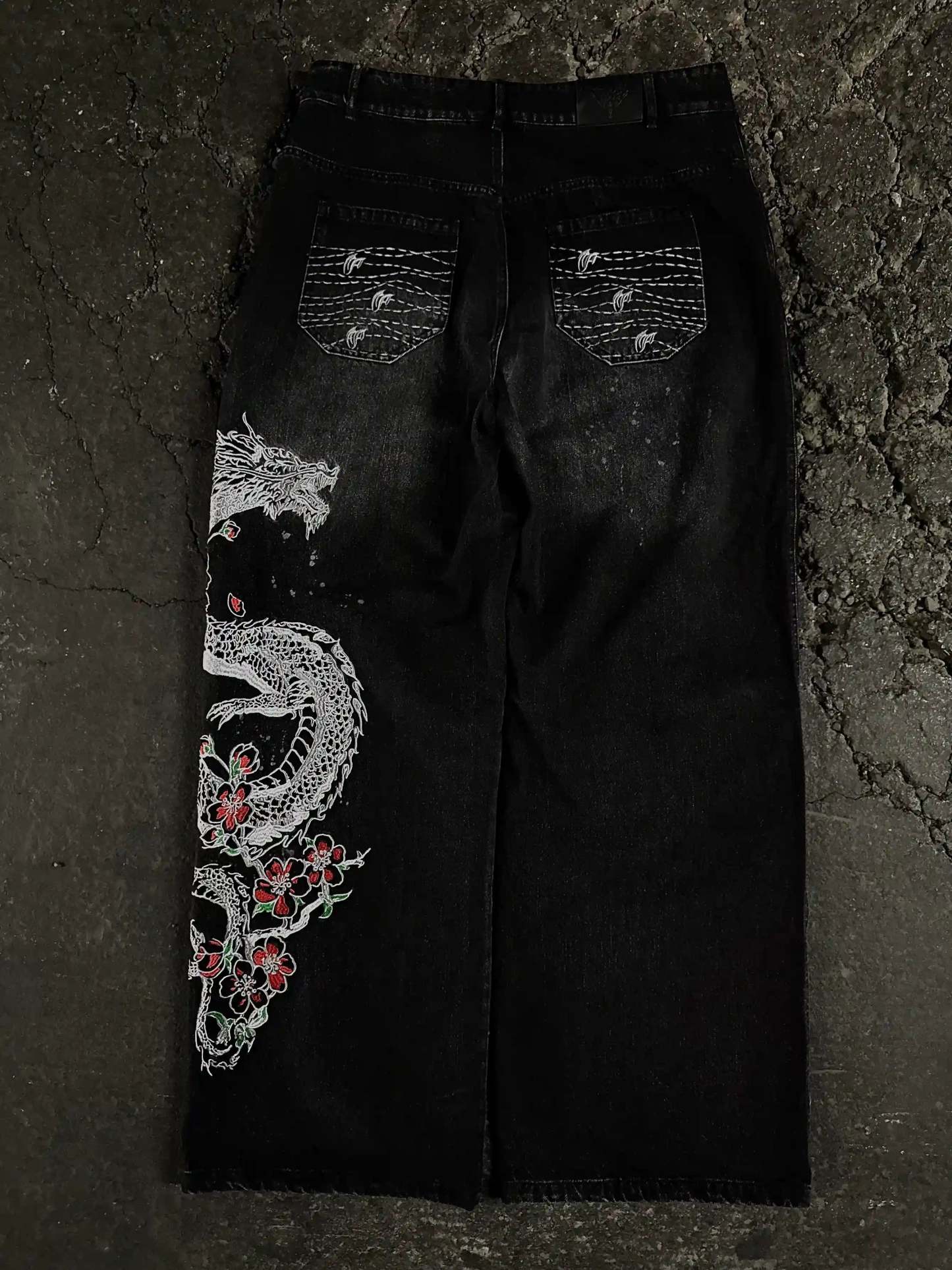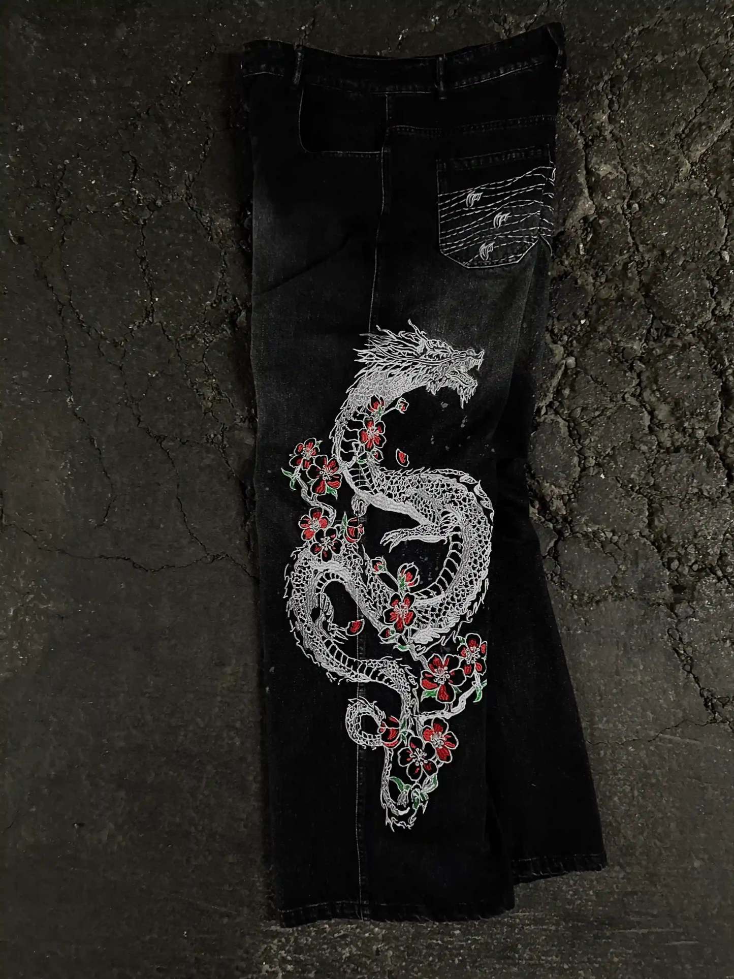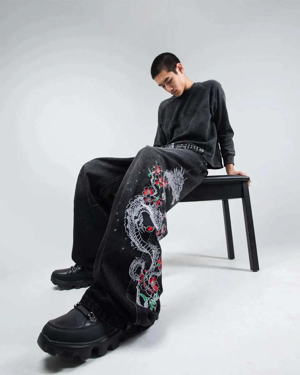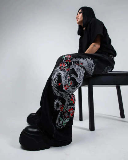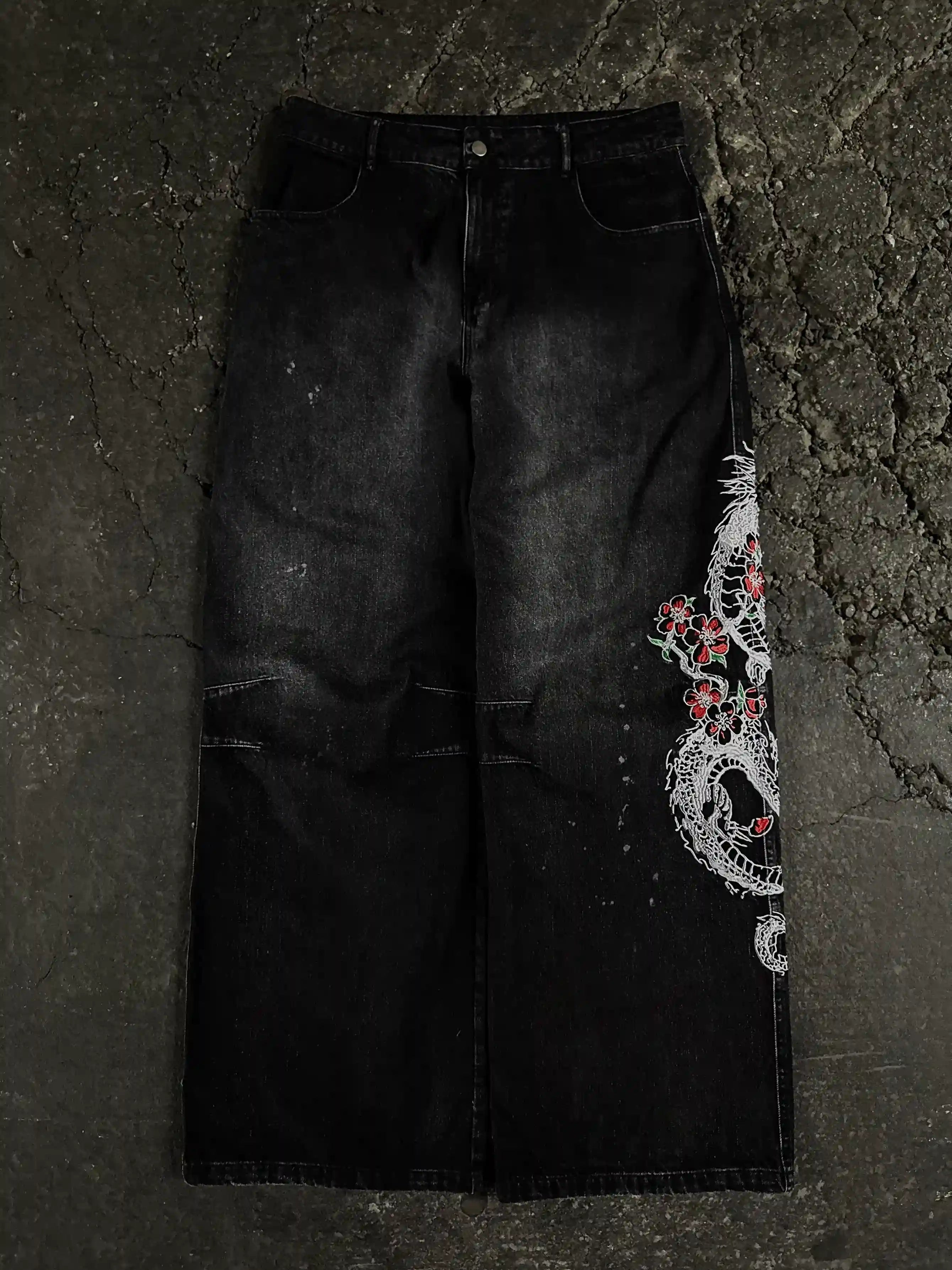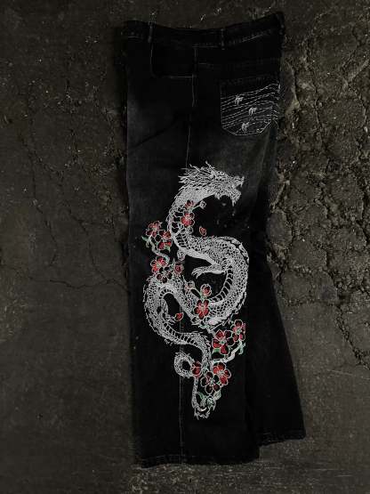 • Left leg embroidered graphic: 'Sakura Dragon'