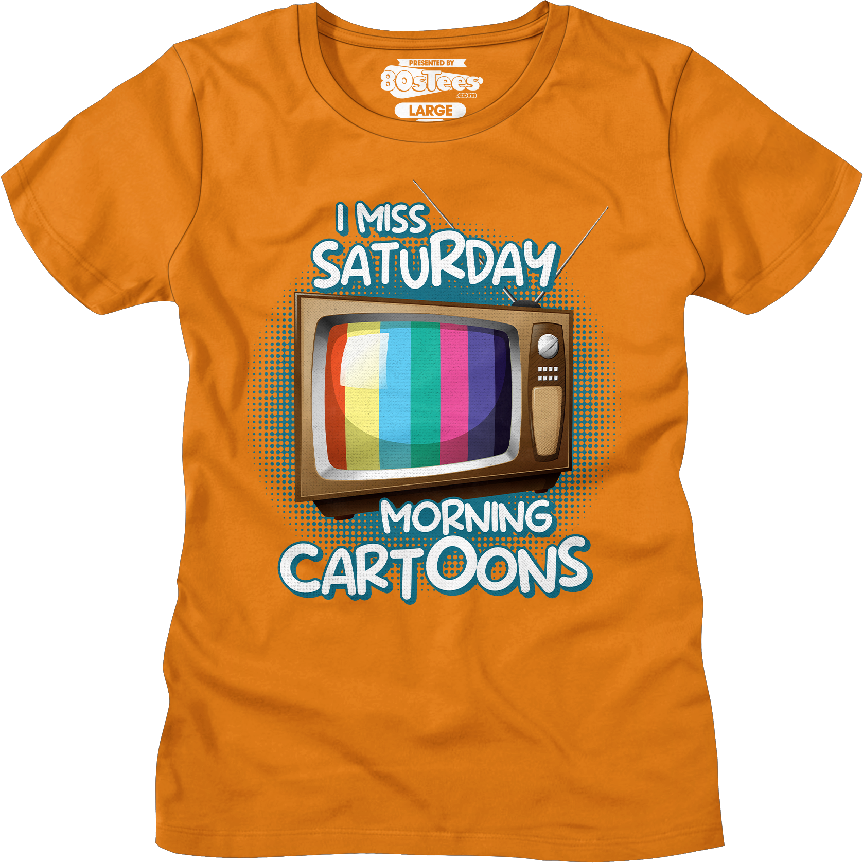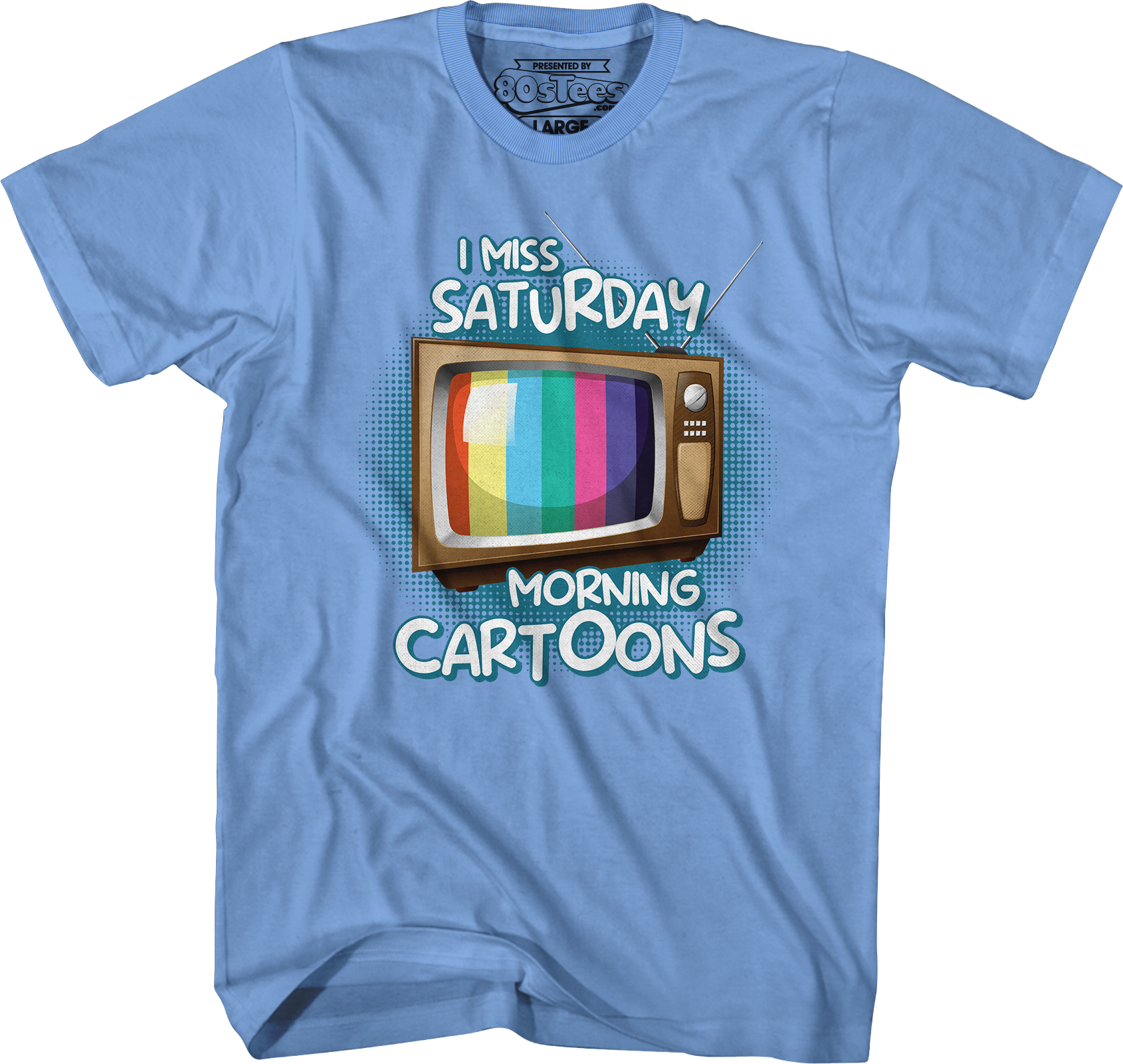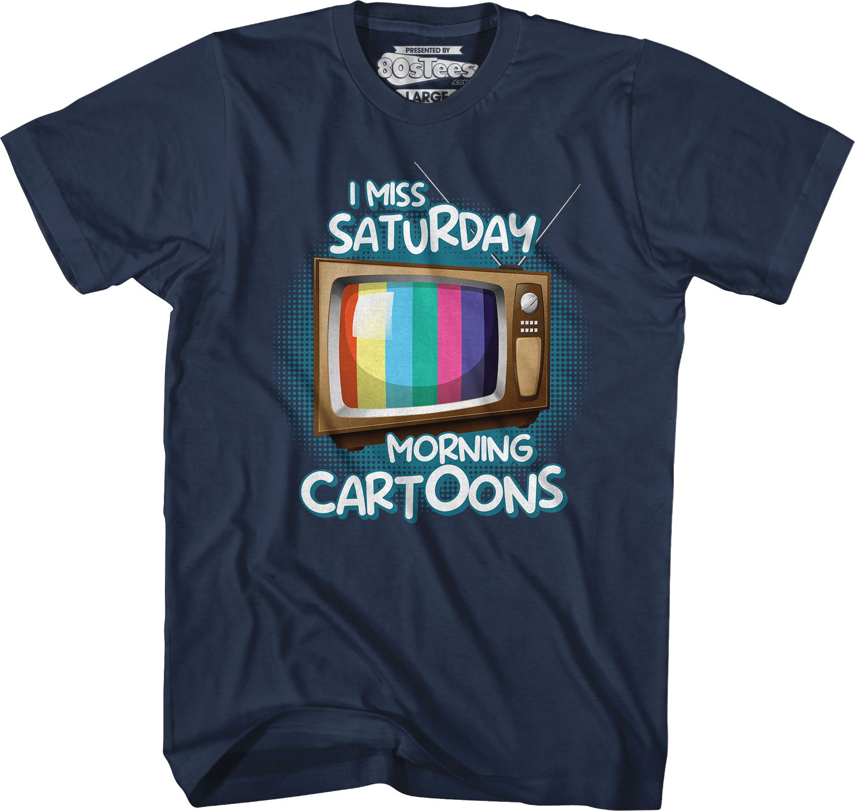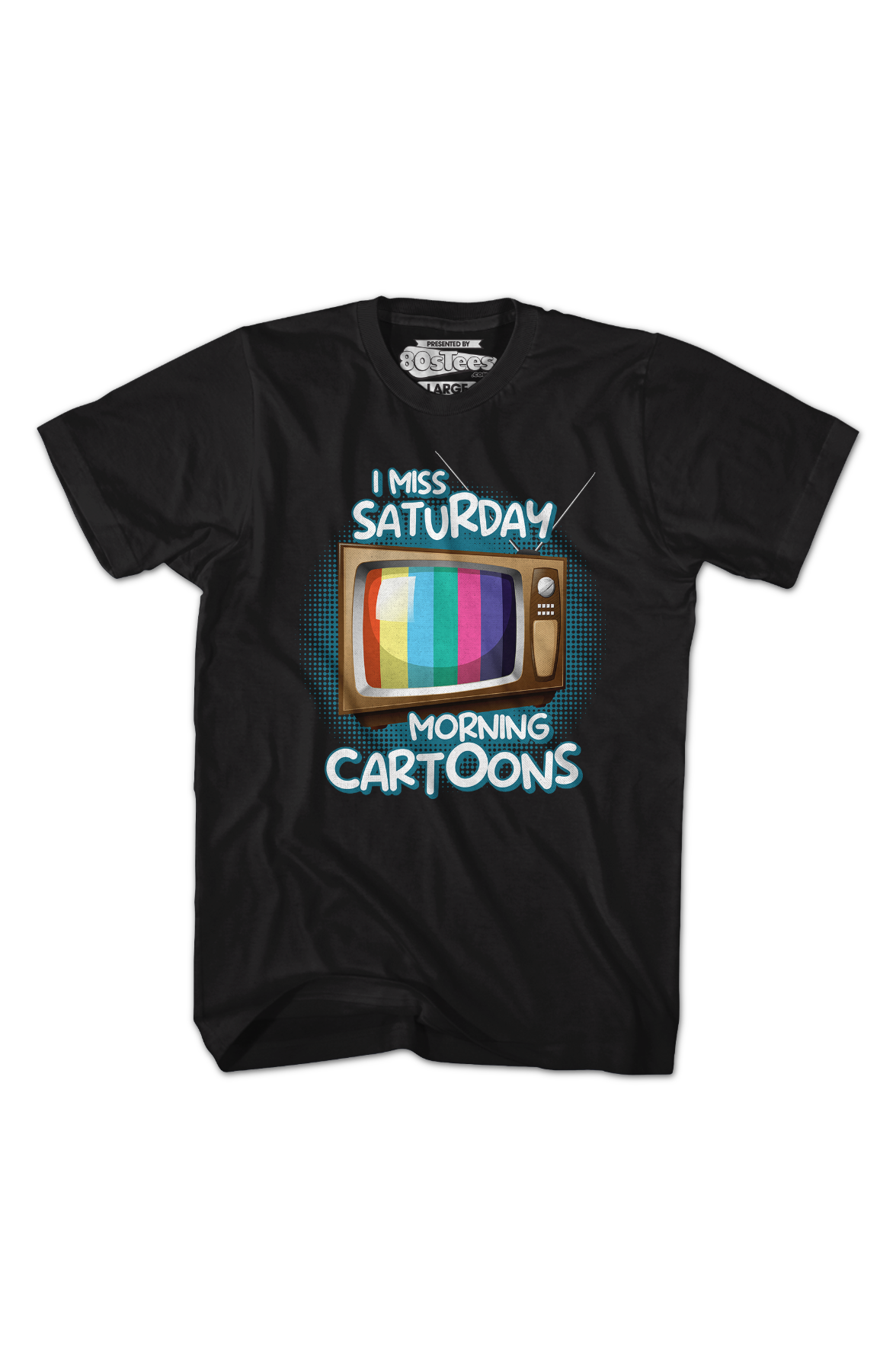 This 80sTees.com exclusive t-shirt features a television set showing a colorful test pattern. The shirt reads I Miss Saturday Morning Cartoons.
