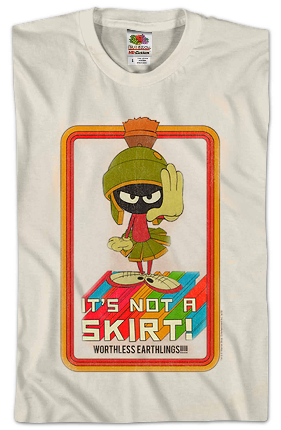This Looney Tunes t-shirt features an image of Marvin The Martian wearing his trademark uniform. The shirt reads It's Not A Skirt! Worthless Earthlings!!!!