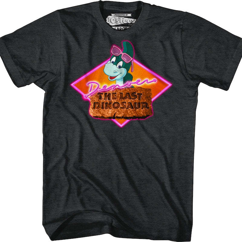 This 80sTees.com exclusive Denver The Last Dinousaur t-shirt features an image of the prehistoric dinosaur and his neon logo.
