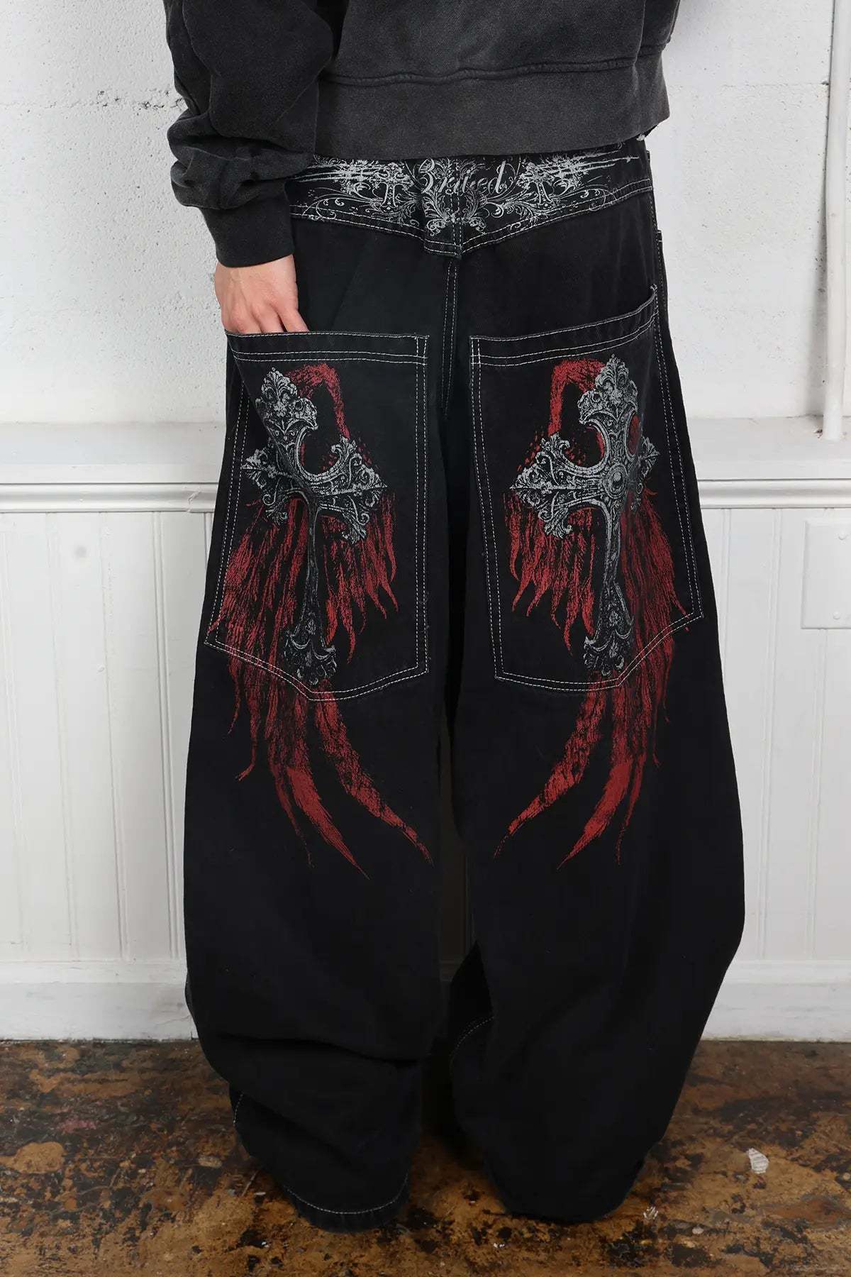 These mid-weight denim jeans are crafted for durability and everyday comfort, with premium cotton that feels great and lasts. Designed with a relaxed, baggy fit & a wide leg opening, they’re made to move with you. Finished with detailed screenprint that'll last life's roughest moments.