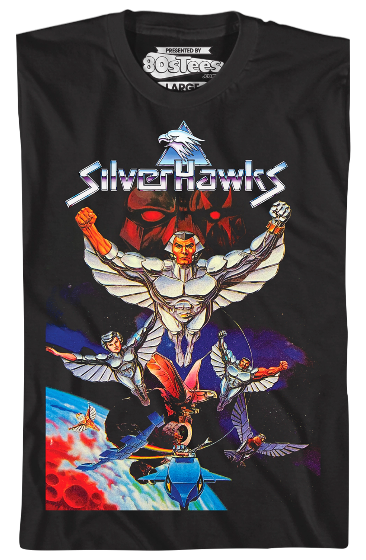 This 80sTees.com exclusive SilverHawks t-shirt features the animated bionic heroes in their metal armor as they soar through the highway of the heavens in their flight