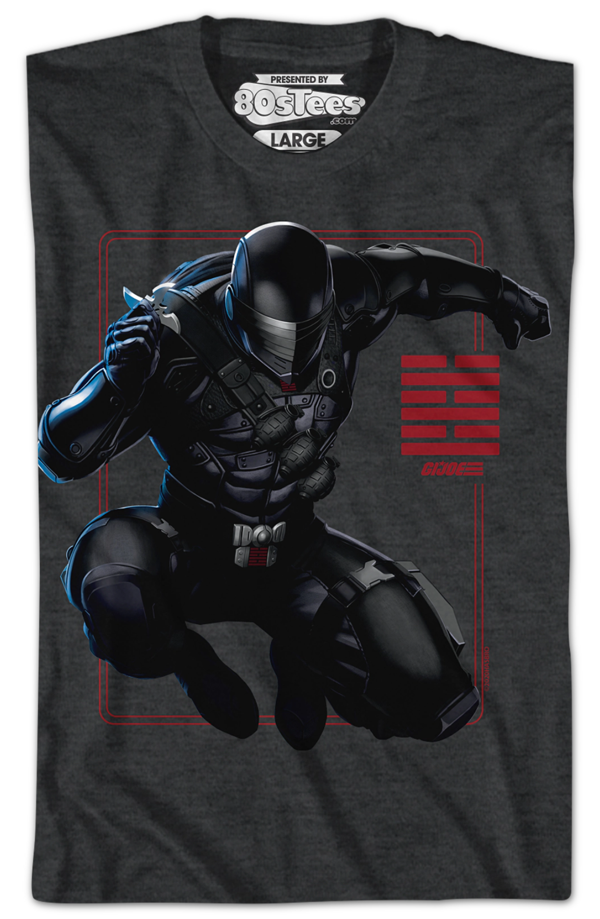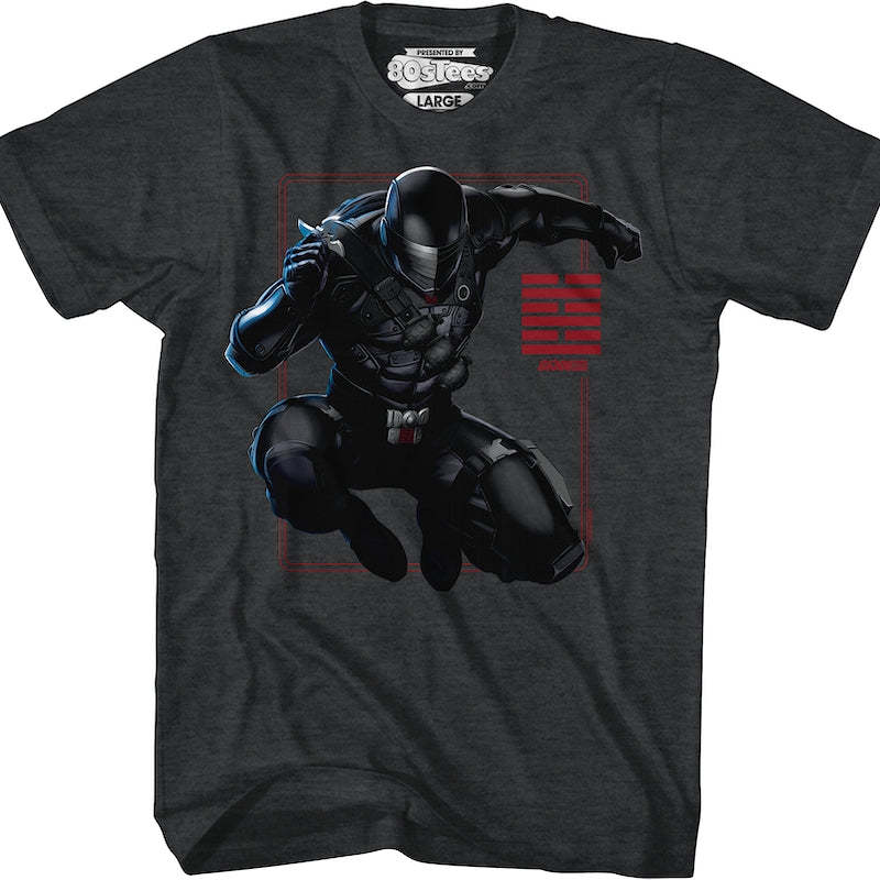 This 80sTees.com exclusive GI Joe t-shirt features an image of Snake Eyes jumping into action to take on the evil forces of Cobra. The shirt includes the logo for the Arashikage Clan.