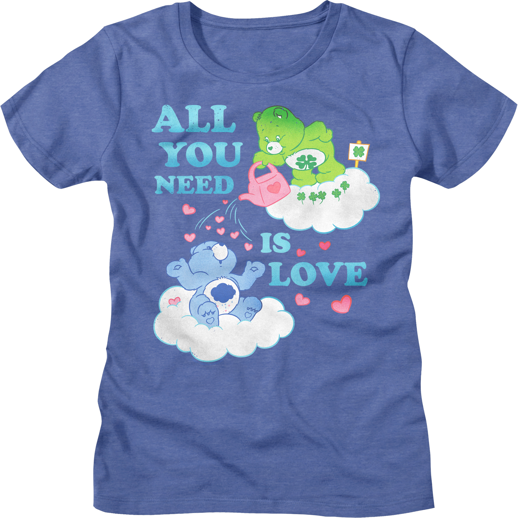 Good Luck Bear was given the almost impossible Caring Mission of making Grumpy Bear feel less grouchy. This womens Care Bears shirt shows Good Luck Bear pouring a watering can that includes hearts on Grumpy Bear. The shirt reads All You Need Is Love.