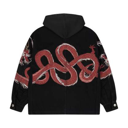 14oz denim / 460gsm brushed cotton hood / 100% cotton / embroidery on back and sleeves / pockets on front / custom buttons / fits true to size