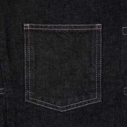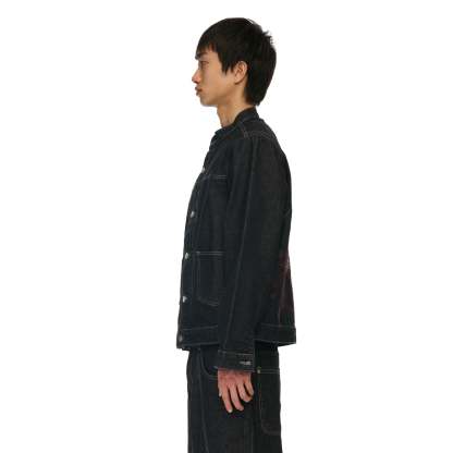 14,5oz raw denim / 100% cotton / fan-cut at back and right sleeve / embroidery on back / custom buttons / fits true to size