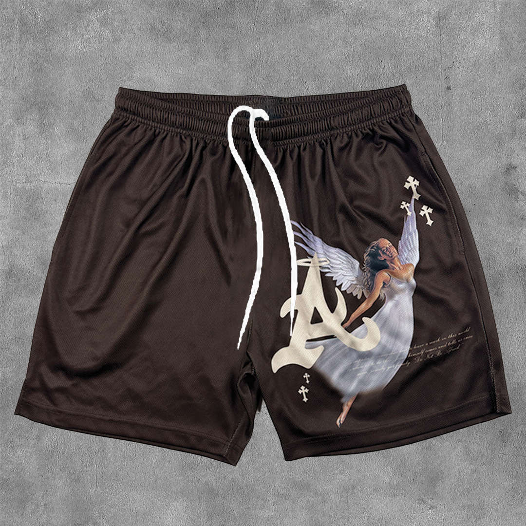 Angel Cross Letter Print Mesh Shorts