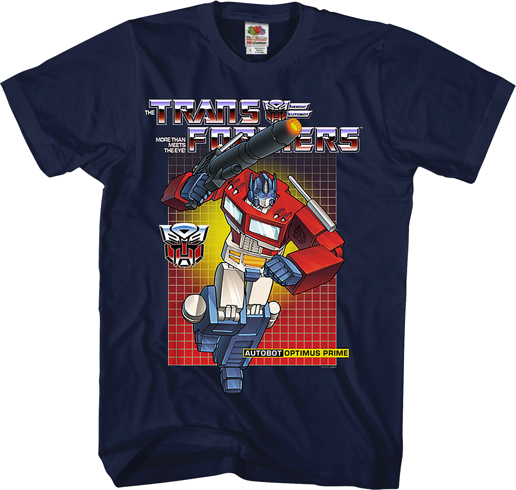 This Transformers t-shirt shows the leader of the Autobots, Optimus Prime running into action with his trusty ion blaster. This image is designed to look like the artwork that would appear on a box for an Optimus Prime action figure.
