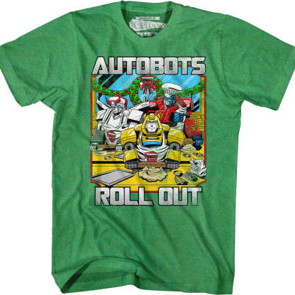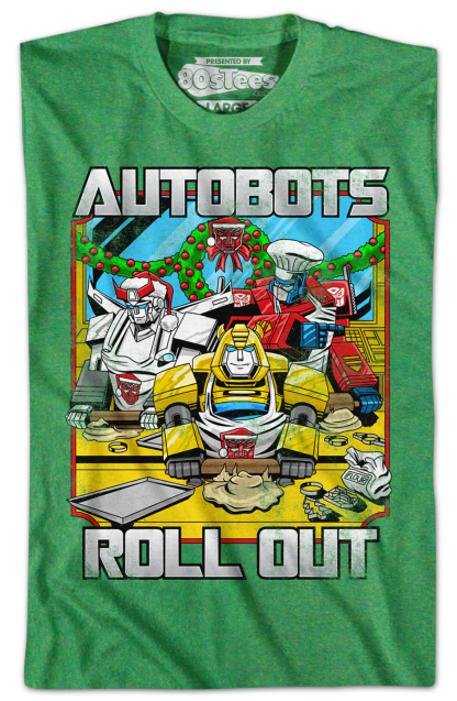 This 80stees.com exclusive Transformers t-shirt shows Autobots preparing to make Christmas cookies. Optimus Prime is giving his usual demand, "Autobots Roll Out!" as Prime, Prowl, and Bumblebee use rolling pins to roll out cookie dough.