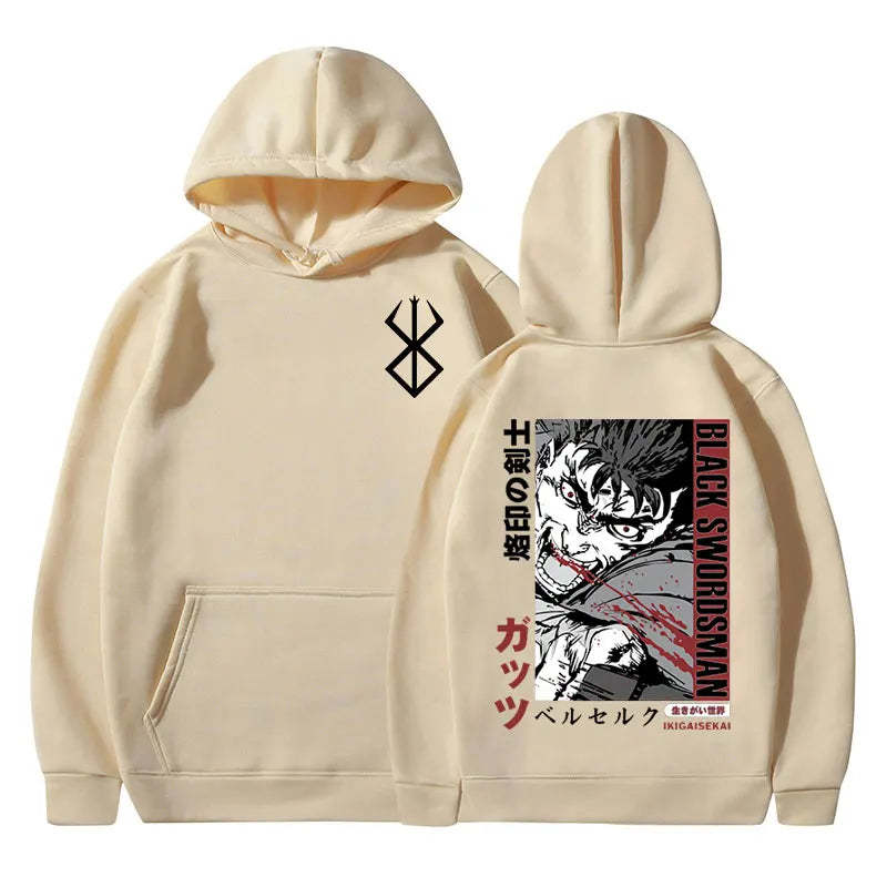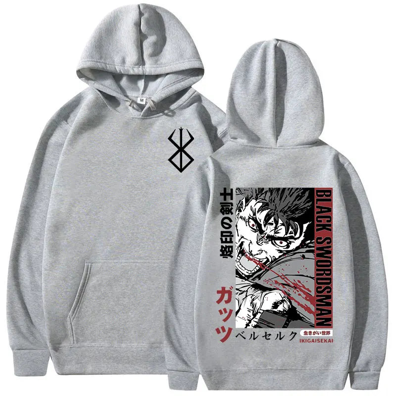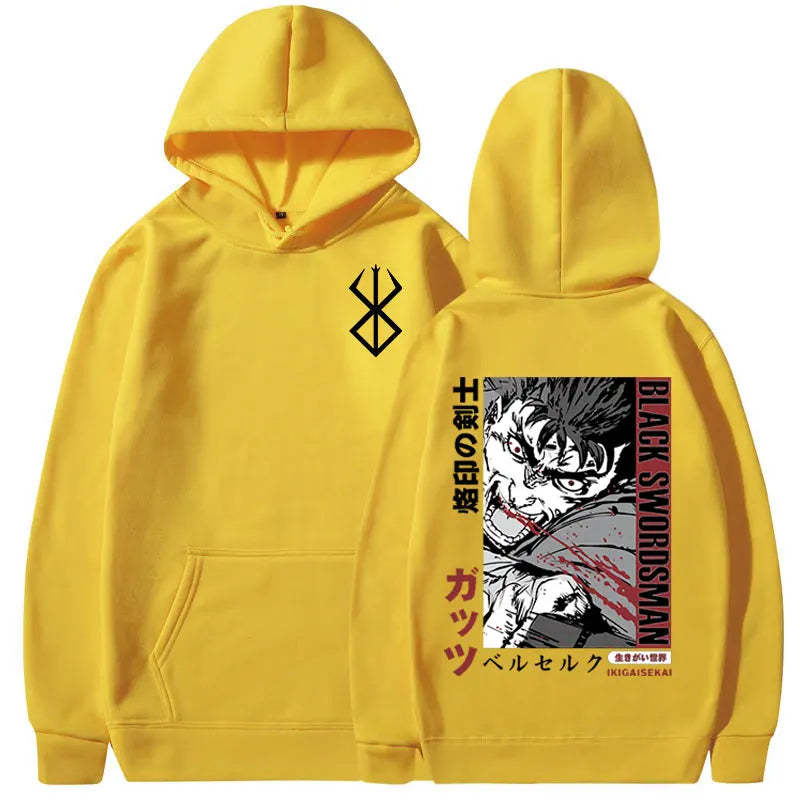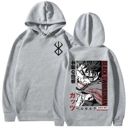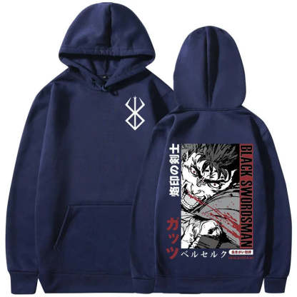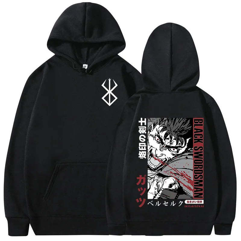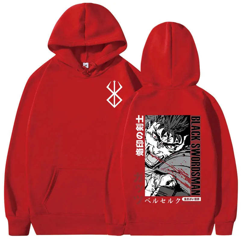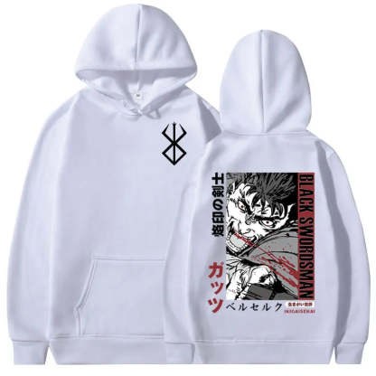 Berserk Graphic Hoodie. High-quality pullover hoodie featuring a vibrant Berserk design. Soft, durable blend of cotton and polyester for comfort and longevity. Roomy kangaroo pocket. Adjustable drawstring hood. Ribbed cuffs and waistband. Available in sizes S-3XL. Machine washable (cold, inside out). Perfect for Berserk enthusiasts and casual anime style. Ideal for cool weather, lounging, or anime conventions. Pairs well with jeans or joggers for a complete look.