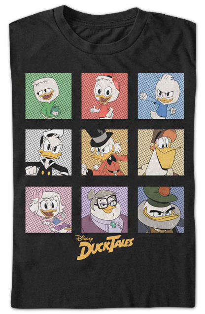 This DuckTales t-shirt features boxed images of the animated series' most popular characters. The shirt shows Louie, Huey, Dewey, Donald Duck, Scrooge McDuck, Launchpad McQuack, Webby Vanderquack, Mrs. Bentina Beakley, and Flintheart Glomgold.