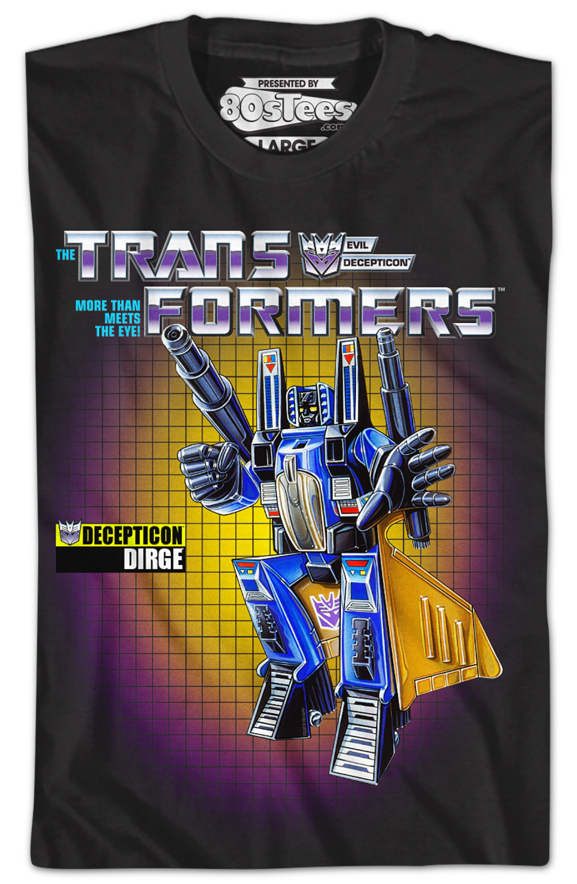 This 80sTees.com exclusive Transformers t-shirt features the artwork that appeared on the box for the G1 Dirge action figure.