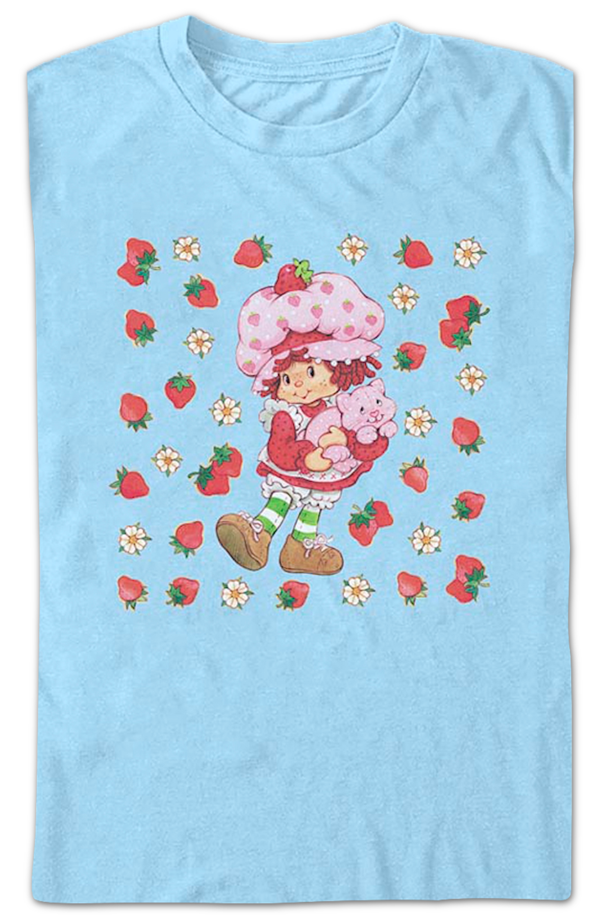 Strawberry Shortcake lives in a magical land called Strawberryland with her cat, Custard. Strawberry Shortcake's adventures revolve around their adventures and the importance of friendship, kindness, and cooperation. Strawberry Shortcake has consistently remained a beloved and iconic character in children's entertainment for decades. Everyone will know you are a fan when you wear this Flower Field Strawberry Shortcake T-Shirt!