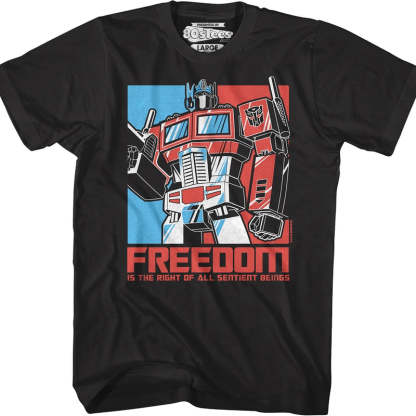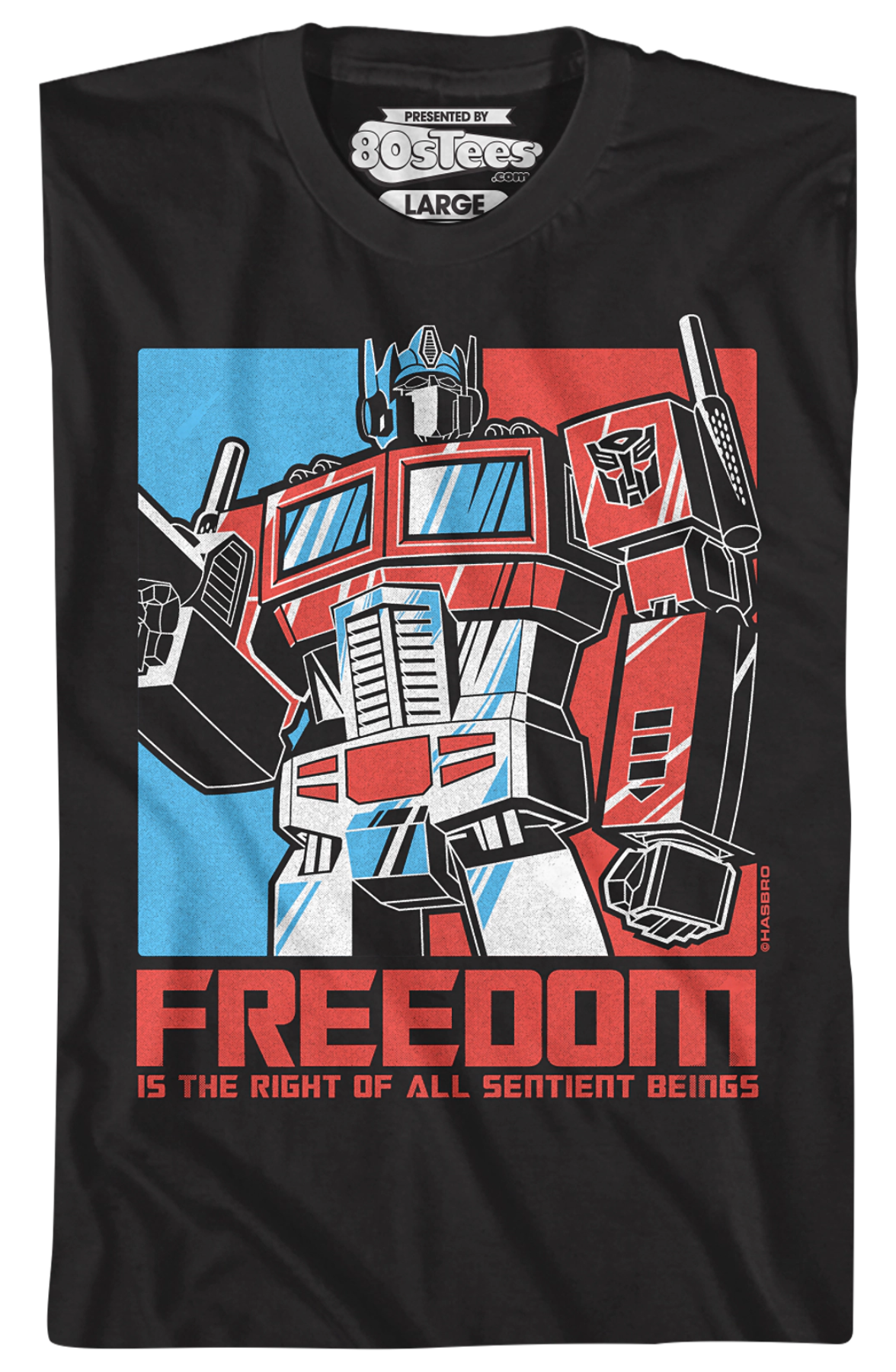 For any fan of the leader of the Autobots, this 80sTees.com exclusive Freedom Is The Right Of All Sentient Beings Transformers T-Shirt is a must have!