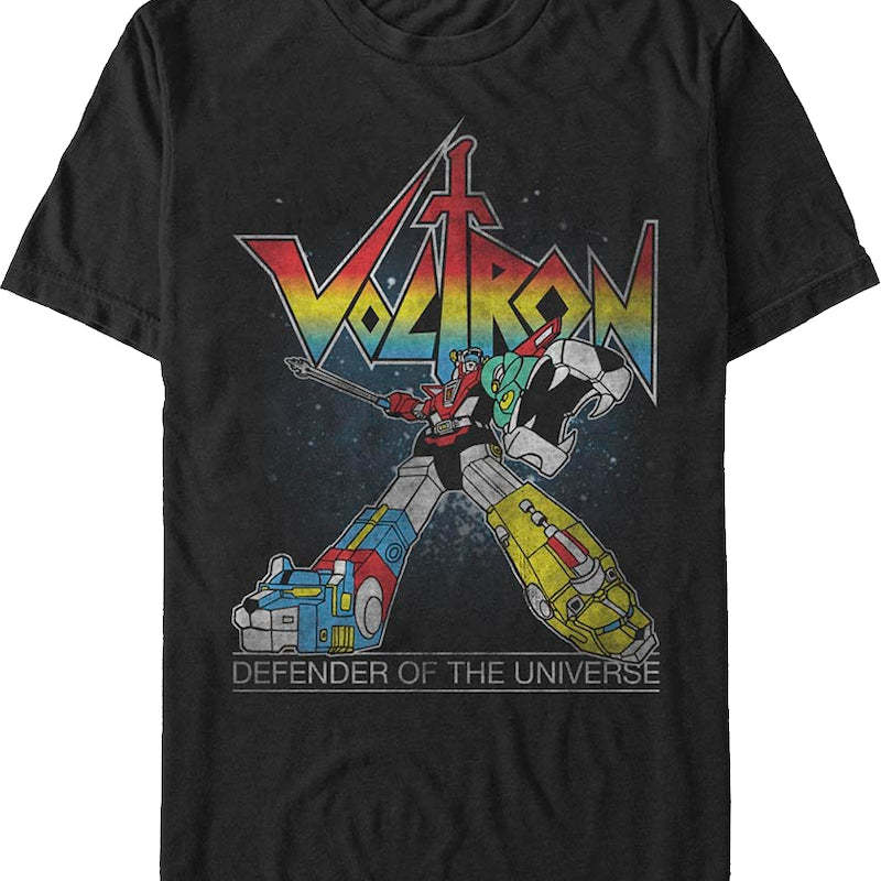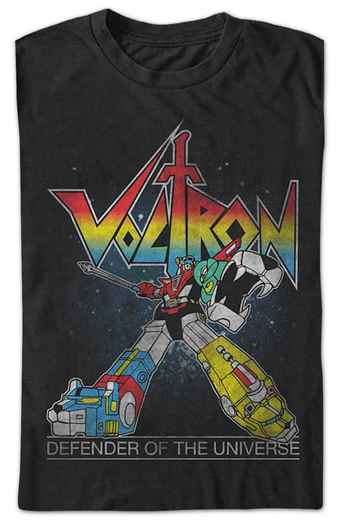 Pilots Keith, Pidge, Hunk, Sven, and Lance connect their lion vehicles together to form this mighty Defender of the Universe. With the good planets of the solar system, Voltron maintains peace throughout the galaxy. Let everyone know you are a fan of the classic animated series with this Heroic Defender Pose Voltron T-Shirt!