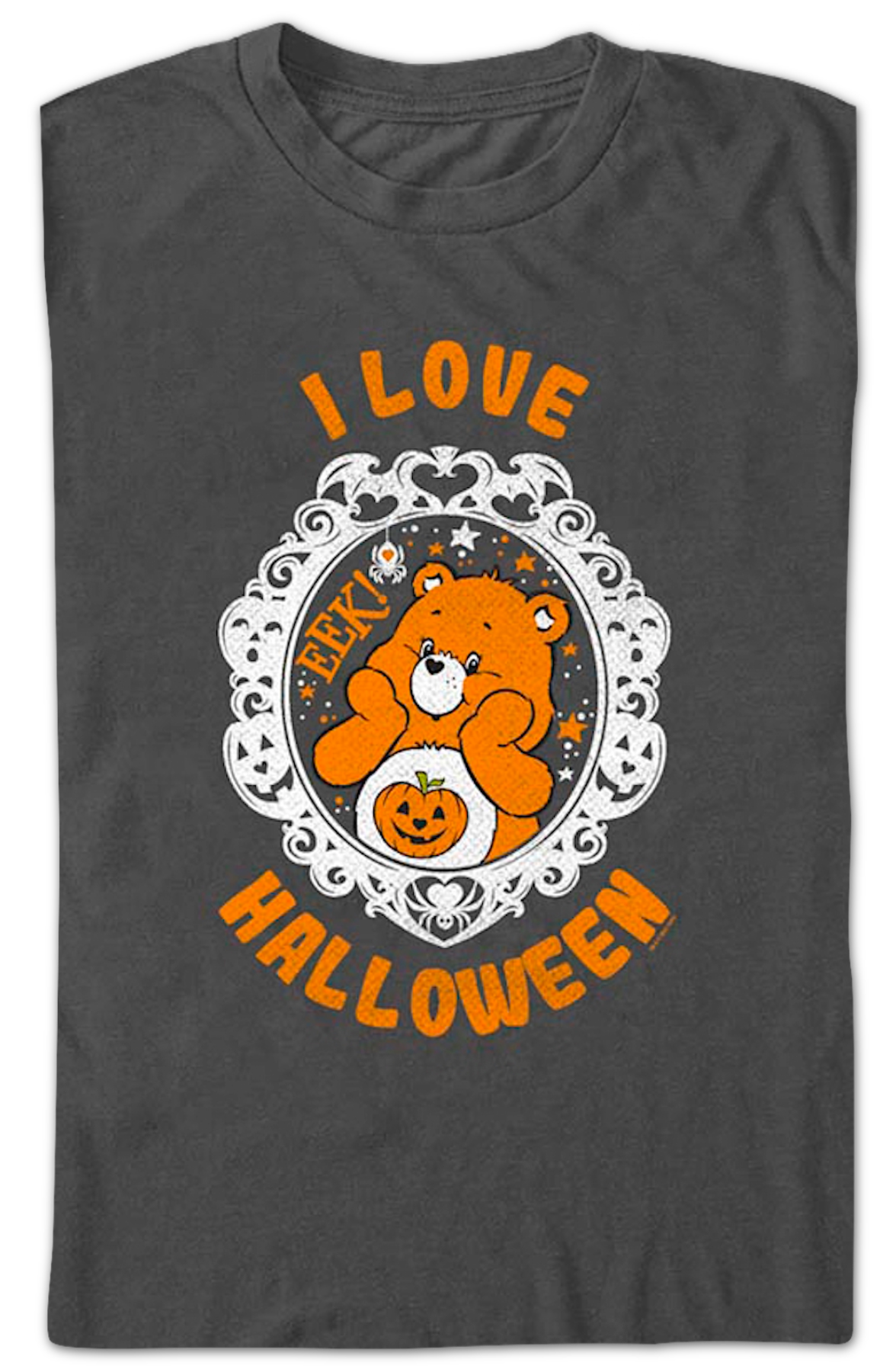 This Care Bears t-shirt shows Tenderheart Bear looking in the mirror at his special Jack-o'-Lantern belly badge. The shirt reads I Love Halloween.