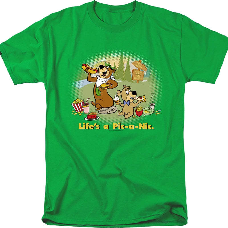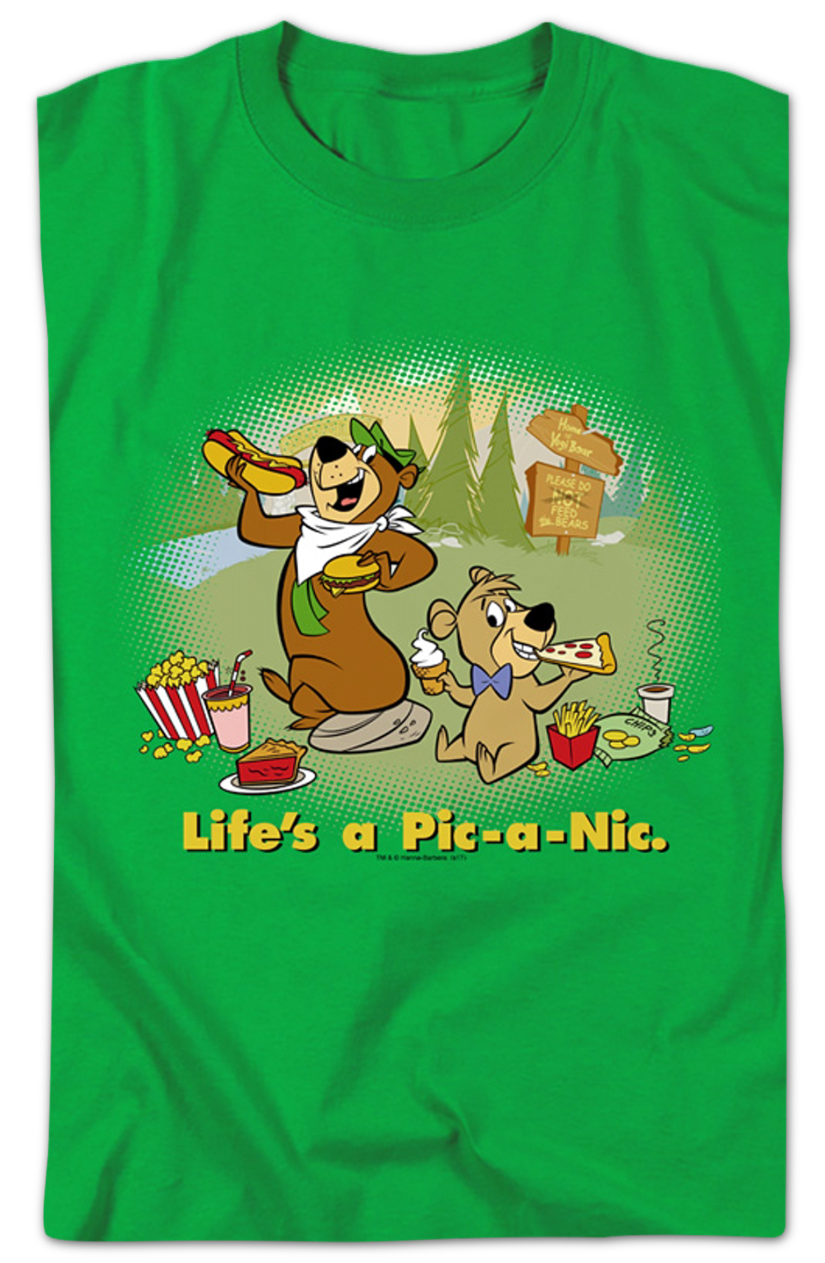This Yogi Bear t-shirt shows Yogi and Boo Boo eating the food they took from campers' picnic baskets in Jellystone Park. The shirt reads Life's a Pic-a-Nic.