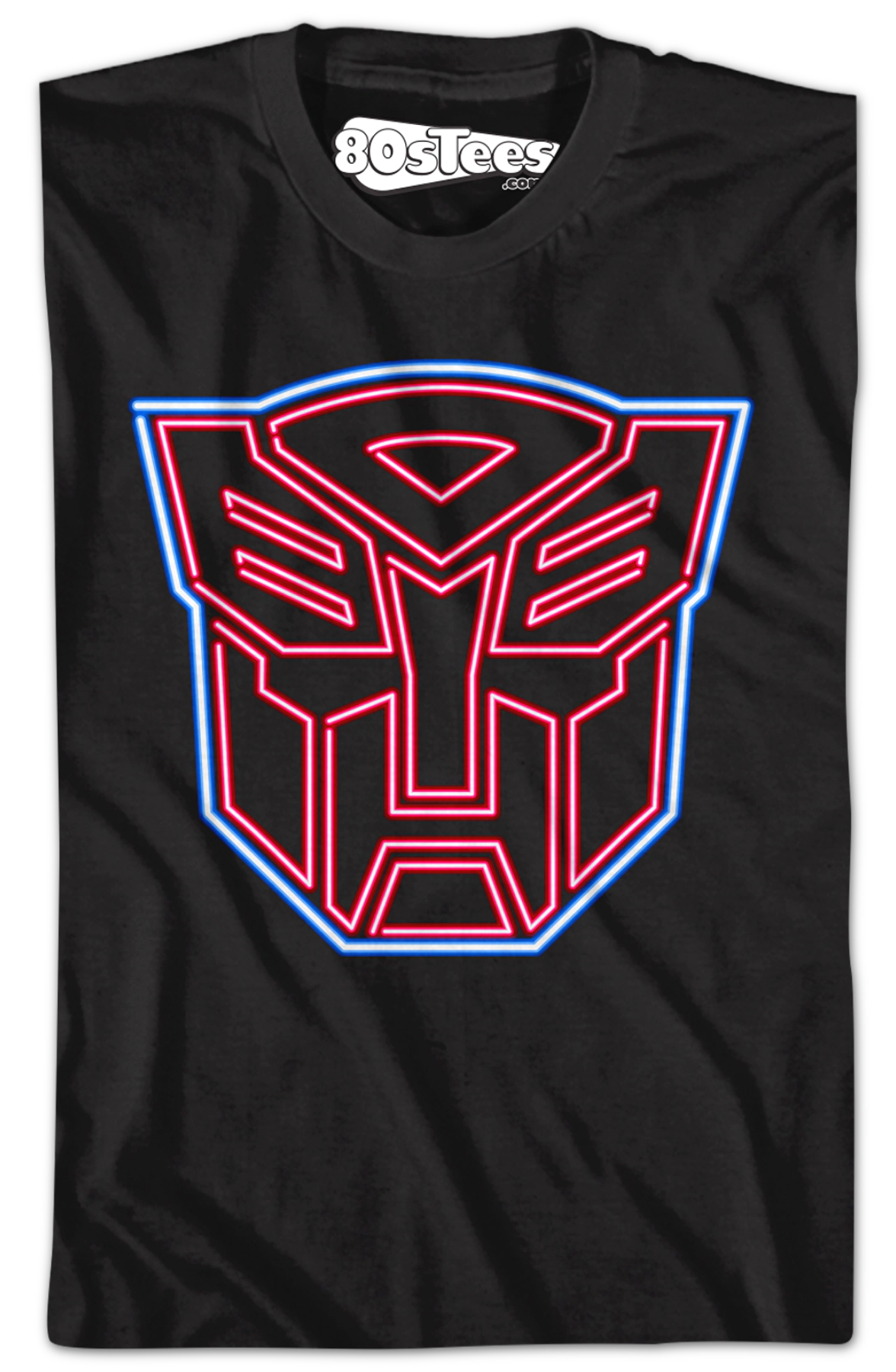 This 80sTees.com exclusive Transformers t-shirt shows an Autobots logo that is glowing in neon colors. The logo features the trademark Autobot colors red and blue.