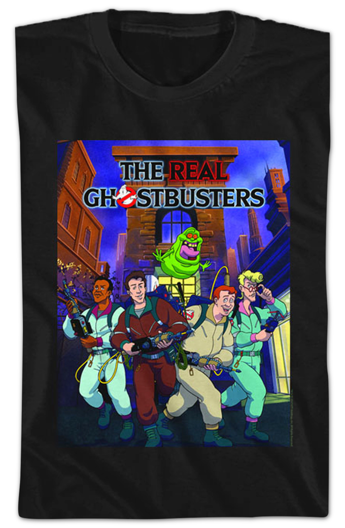 This Real Ghostbusters t-shirt features a promotional poster for the popular animated series. The poster shows Winston Zeddemore, Peter Venkman, Ray Stantz, Egon Spengler and Slimer. The image shows the Ghostbusters on their way to capture something strange in the neighborhood with Slimer along for the fun.