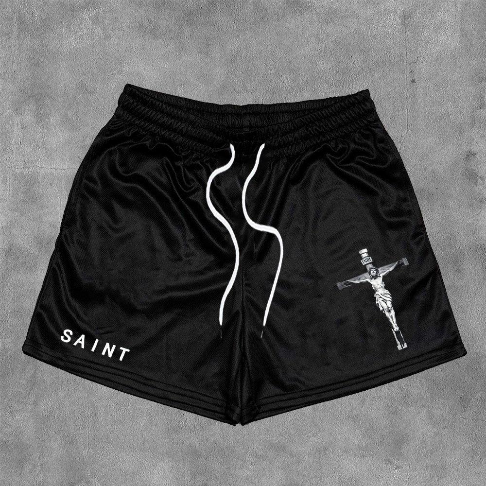 Saint Jesus Cross Print Mesh Shorts