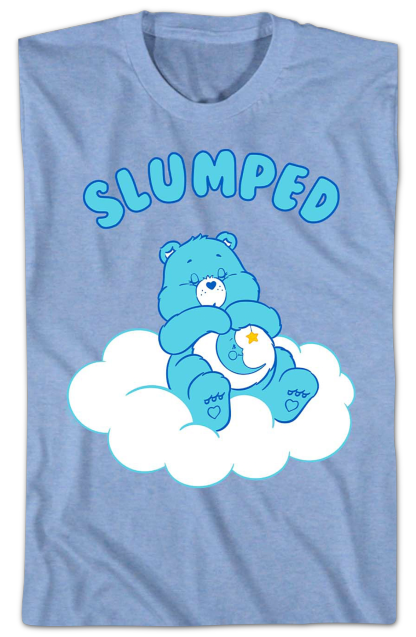 This Care Bears t-shirt shows Bedtime Bear relaxing on a cloud. The shirt reads Slumped.