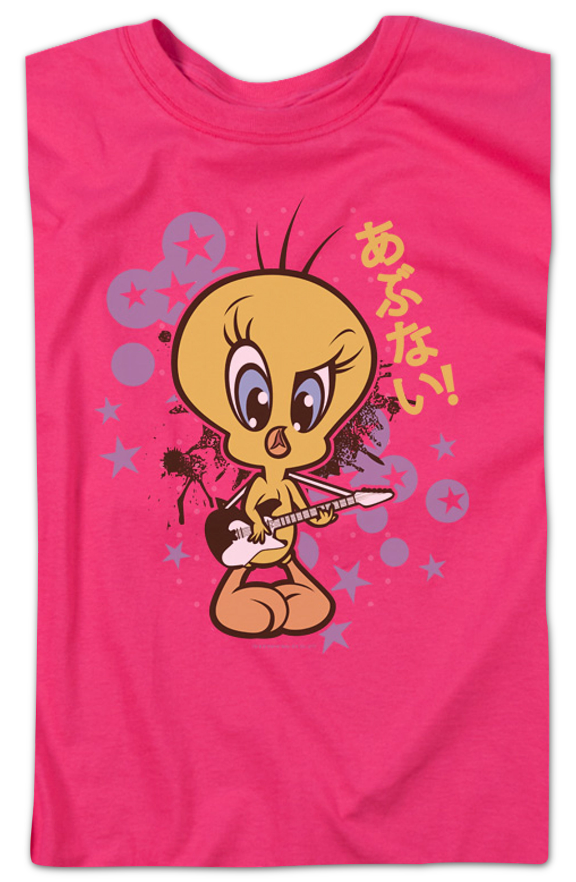 This Looney Tunes t-shirt shows Tweety Bird posing with an electric guitar. Tweety is ready to chase away any predators with a loud guitar solo.