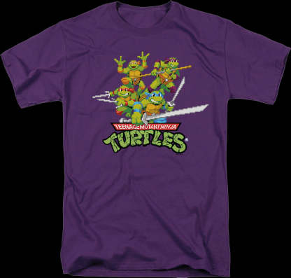 This Teenage Mutant Ninja Turtles t-shirt shows video game versions of Leonardo, Raphael, Michelangelo, and Donatello ready for another adventure.