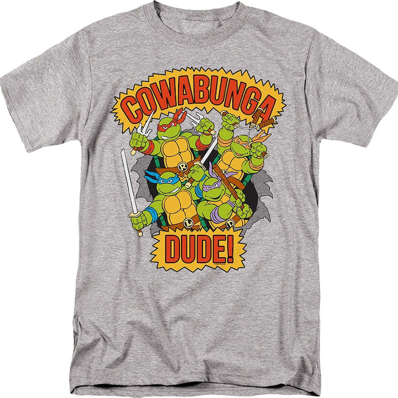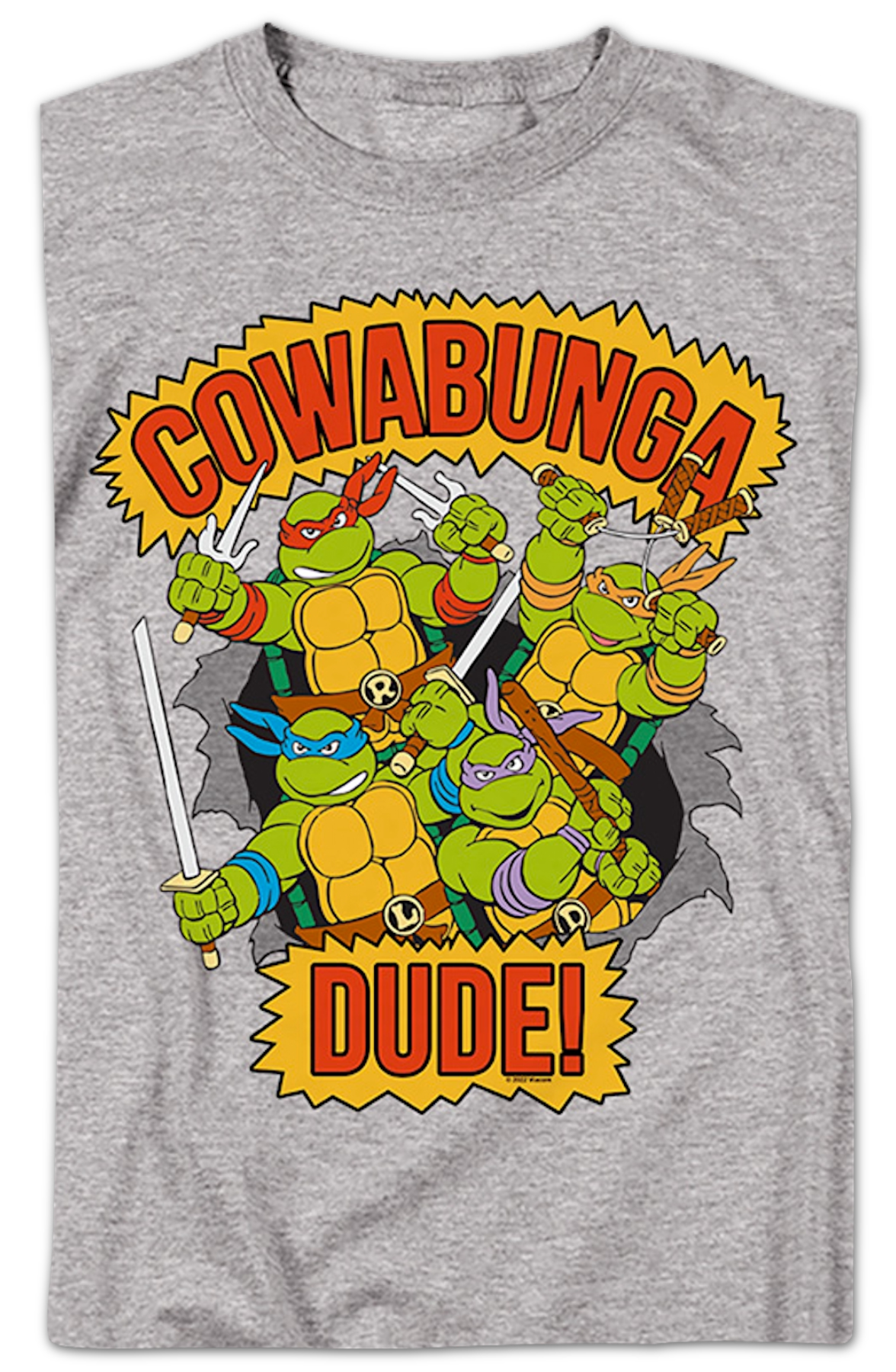 This Teenage Mutant Ninja Turtles t-shirt shows Leonardo, Raphael, Michelangelo, and Donatello breaking through the shirt's stitching, and ready for a fight. The shirt reads Cowabunga Dude!