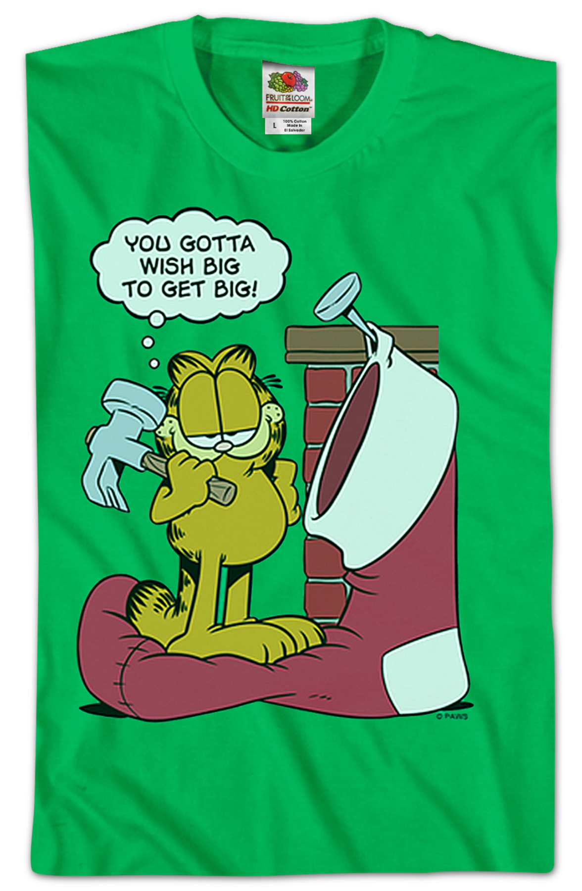 This Wish Big Garfield T-Shirt shows the sarcastic feline hanging a giant Christmas stocking on the mantle. He is holding a hammer and saying, "You gotta wish big to get big!" Garfield debuted in 1978 and quickly became one of the most popular comic strip characters of all time. He is never shy about letting anyone around him know exactly what he wants.