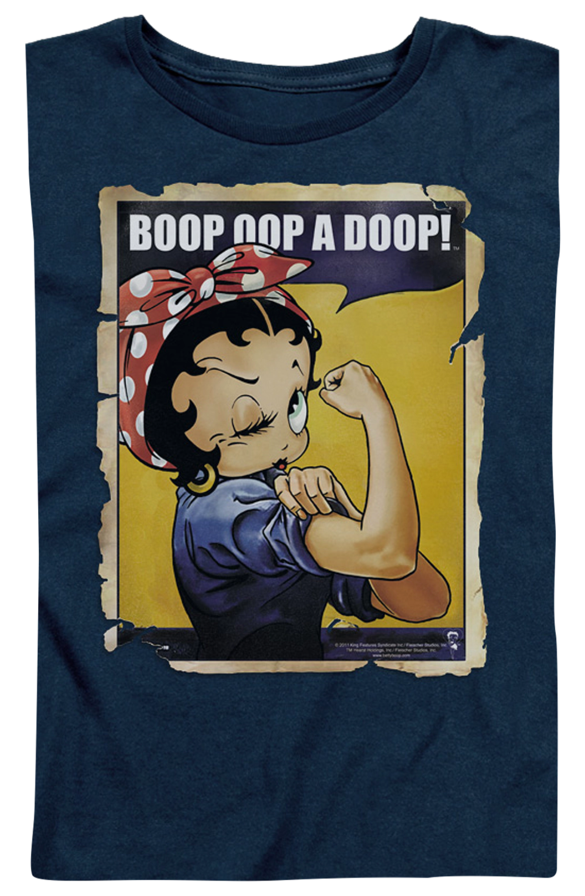 This women's Betty Boop t-shirt features the animated starlet mimicking the classic "Rosie the Riveter" poster from World War II. Instead of the iconic phrase, "We can do it!", Betty encourages you to "Boop oop a doop!"