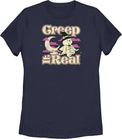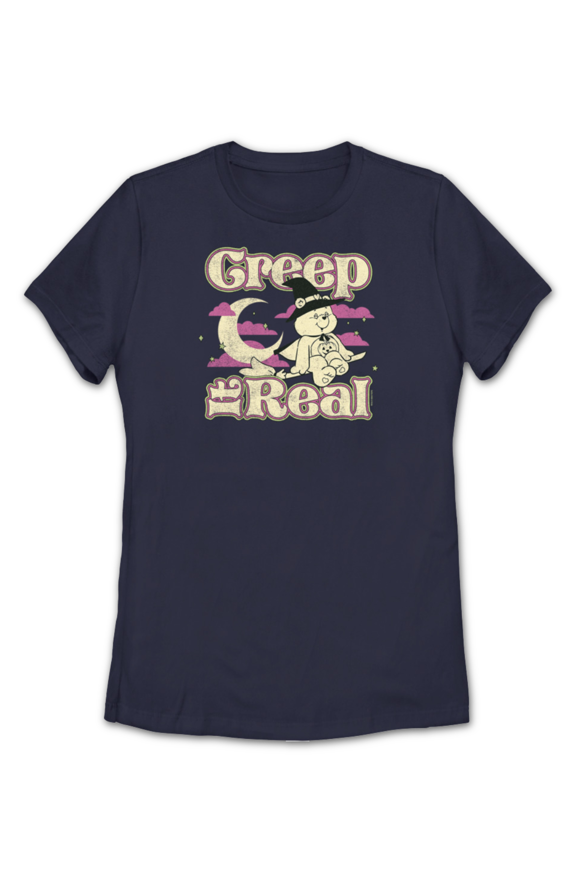 This womens Care Bears shirt shows Trick-Or-Sweet Bear dressed as a witch and riding on a broom on Halloween night. The shirt reads Creep It Real.