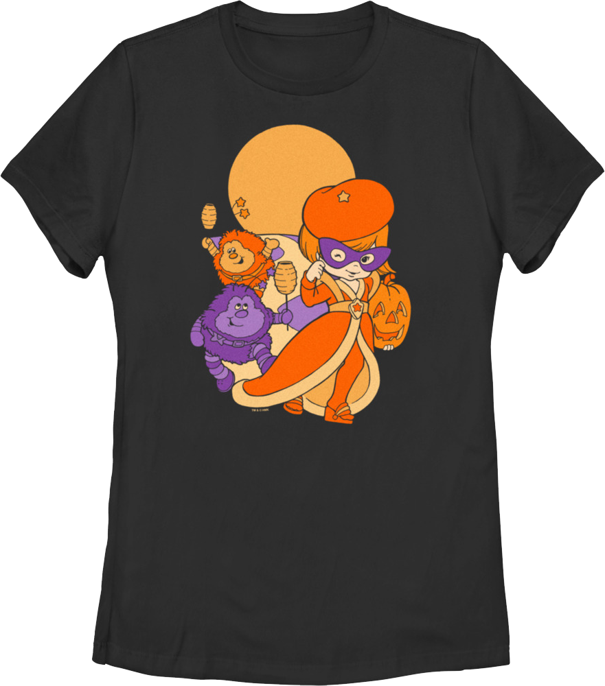 This womens Rainbow Brite shirt shows Lala Orange and her sprite friends Trick-or-Treating on Halloween night.