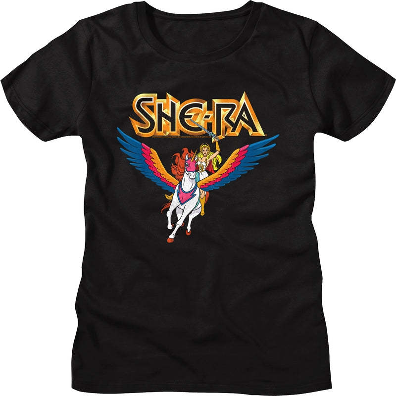 This womens She-Ra shirt features an image of the Princess of Power on her unicorn Swift Wind. She-Ra is seen raising her Sword of Protection.