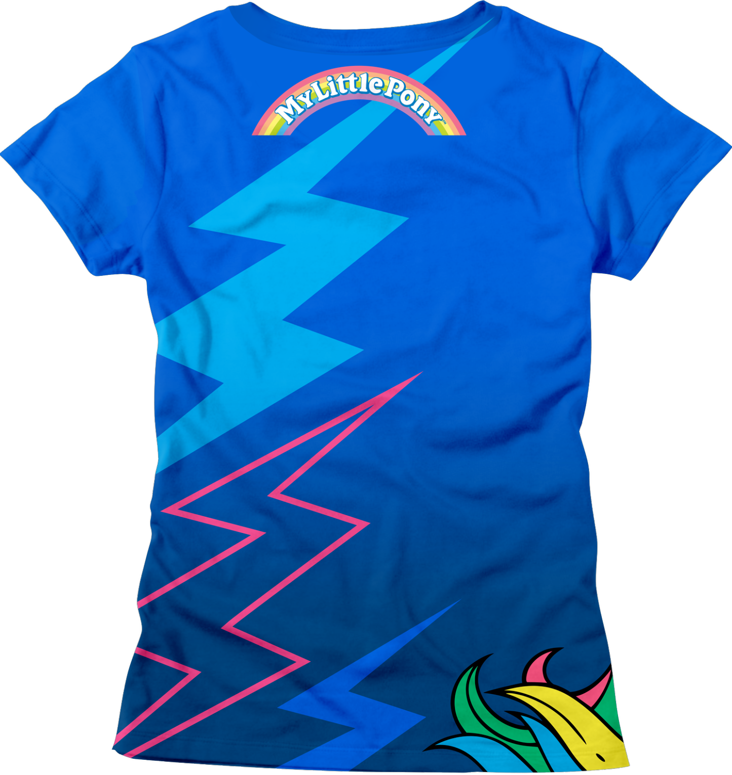 This 80sTees.com exclusive womens My Little Pony shirt features a large image of Sunlight in her bow tie pose. The back of the shirt shows the My Little Pony logo and colorful bolts of lightning.