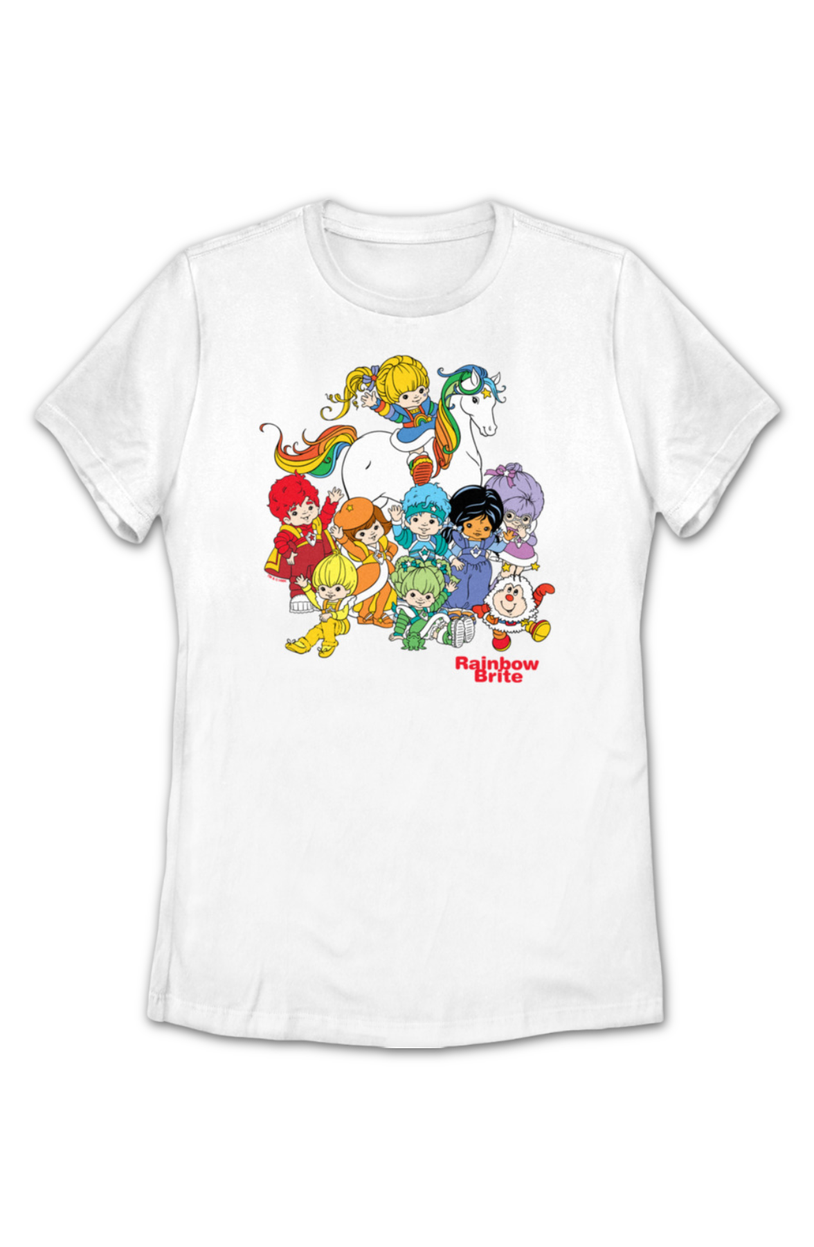 This womens Rainbow Brite shirt shows the iconic cartoon character riding her horse Starlite, and surrounded by friends Red Butler, Canary Yellow, Lala Orange, Patty O'Green, Buddy Blue, Indigo, Shy Violet, and Twink.