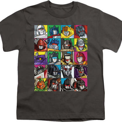This youth Transformers t-shirt features the most popular Autobots and Decepticons, all together in a collage. The shirt shows Megatron, Optimus Prime, Bumblebee, Starscream, Ironhide, Soundwave, Shockwave, Jazz, Hot Rod, and more!
