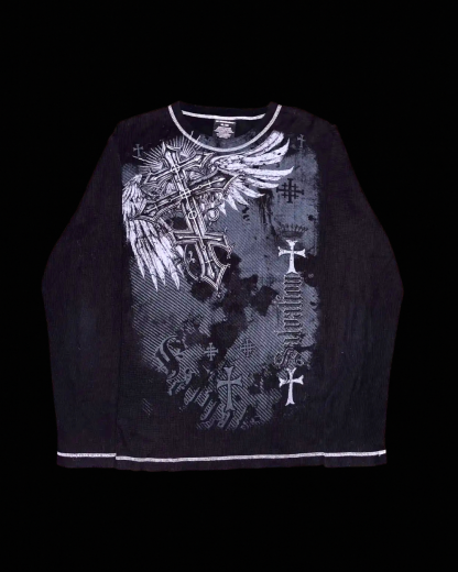 Soft ash-grey tee with an ethereal angel graphic. Wing-spanned artwork cascading from shoulder to hem, distressed collar and hem for a well-worn finish. Relaxed, drapey fit. Cotton blend, true to size, and ready to ship.