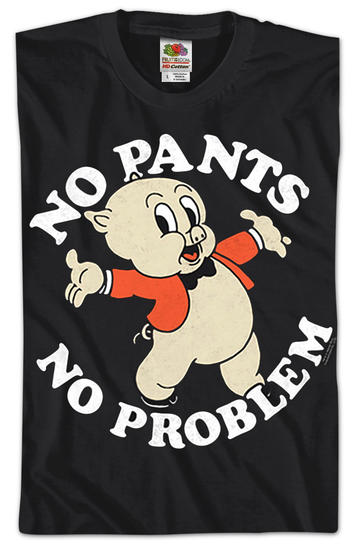 This Looney Tunes t-shirt features an image of Porky Pig in his trademark jacket, bow tie, and no pants. The shirt reads No Pants No Problem.